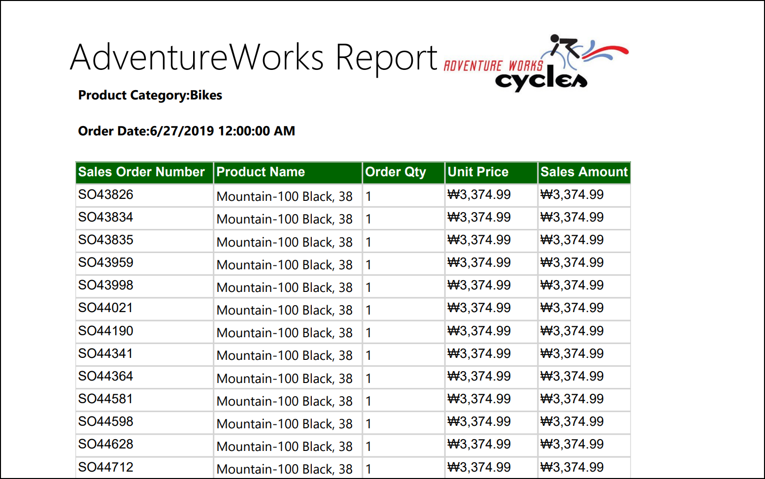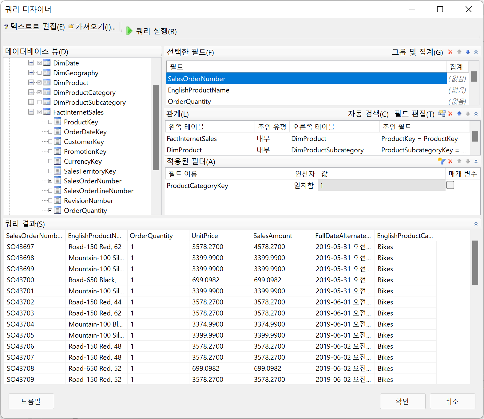 [쿼리 디자이너]를 선택하여 원하는 필드를 선택하면 됩니다. 원하는 필드를 선택하려면 보고서의 스케치를 먼저 확인하여 어떤 테이블의 어떤 필드를 하나의 데이터 세트로 묶을지를 결정해야 합니다. 위 스케치의 테이블 같은 경우는 SalesOrderNumer, Product Name, Order Quantity, Unit Price, Sales Amount 가 있으며, 또한 보고서 윗단에 있는 Product Category와 OrderDate가 포함되어 있습니다. 이를 확인하여 보고서 세트를 생성해야 합니다. 테이블 구조나 쿼리 구문을 잘 알고 있어야 데이터 세트를 생성하는 것이 쉽습니다.