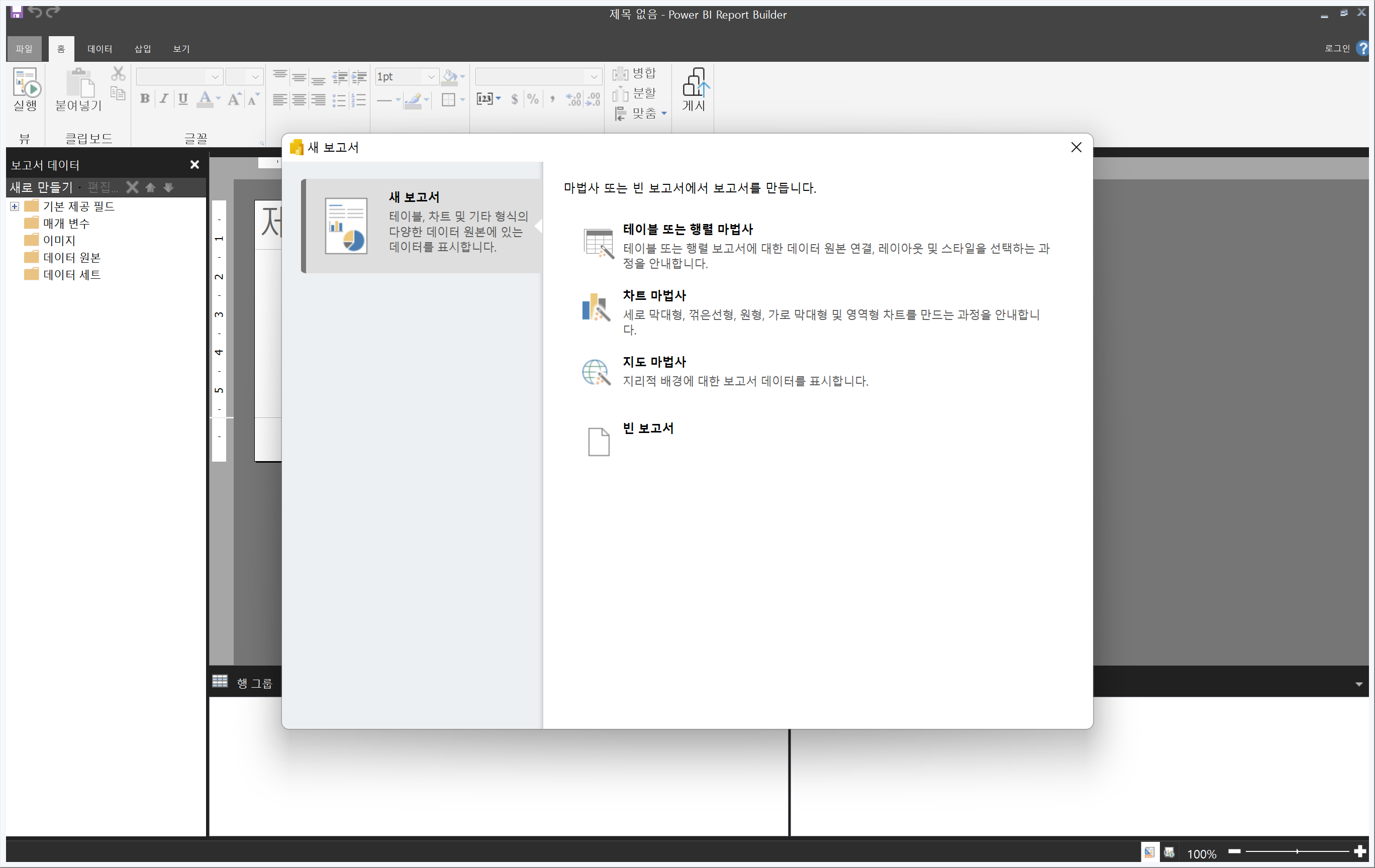 보고서 작성기(Power BI Report Builder)를 실행하면 다음과 같은 모습을 볼 수 있습니다. 마법사로 보고서를 만들거나 빈 보고서를 통해 수작업으로 생성할 수 있습니다. 물론 [빈 보고서]를 클릭합니다.