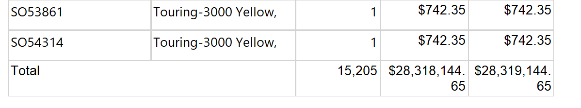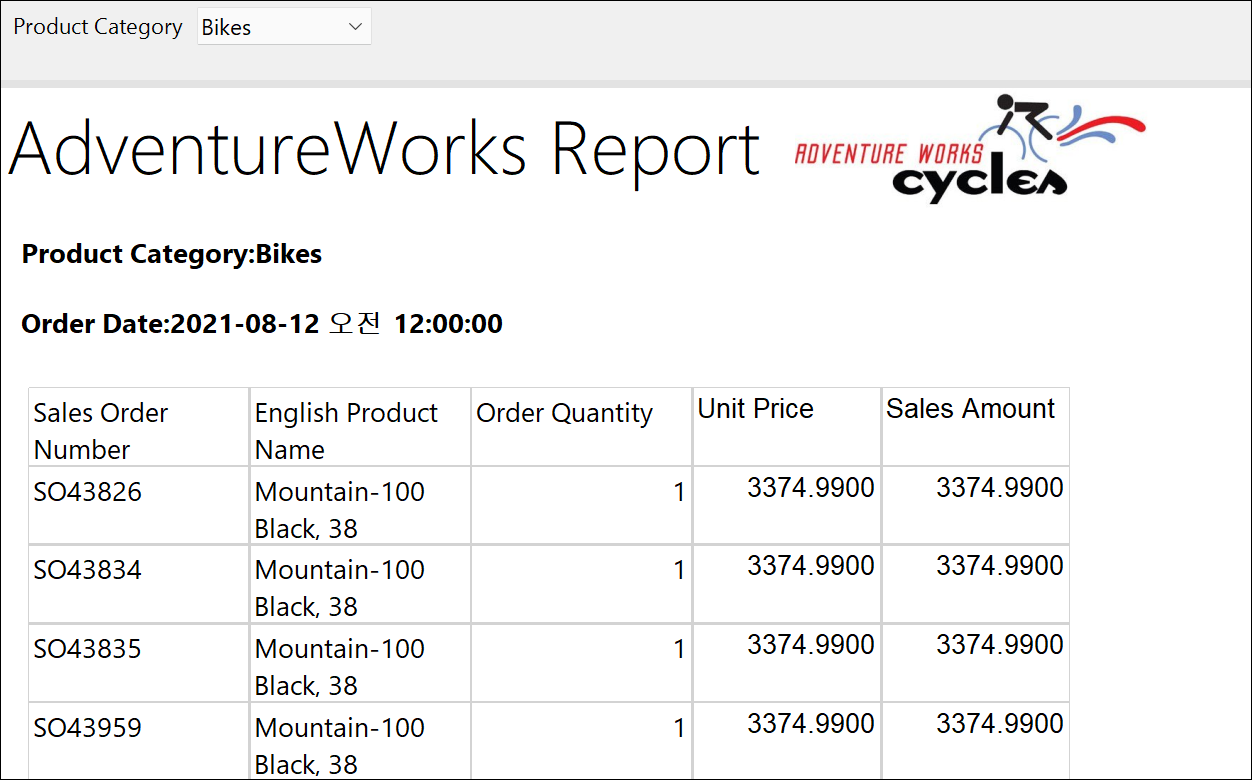 Price 등 데이터 형식을 변경해보겠습니다. SalesAmount 데이터 필드의 모서리가 선택되도록 합니다. 그후 홈 탭의 숫자 부분에서 통화, $, 소수점 2자리로 설정합니다. 속성 창의 Format 속성에 직접 '$'#,0.00;('$'#,0.00)을 지정해도 됩니다. 필요하다면 정렬을 변경해주면 됩니다.