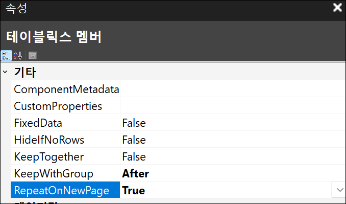 그러면 열 그룹에서 정적을 볼 수 있습니다. 첫번째 정적을 클릭하여 속성 창에서 RepeatOnNewPage를 True로 변경해줍니다.