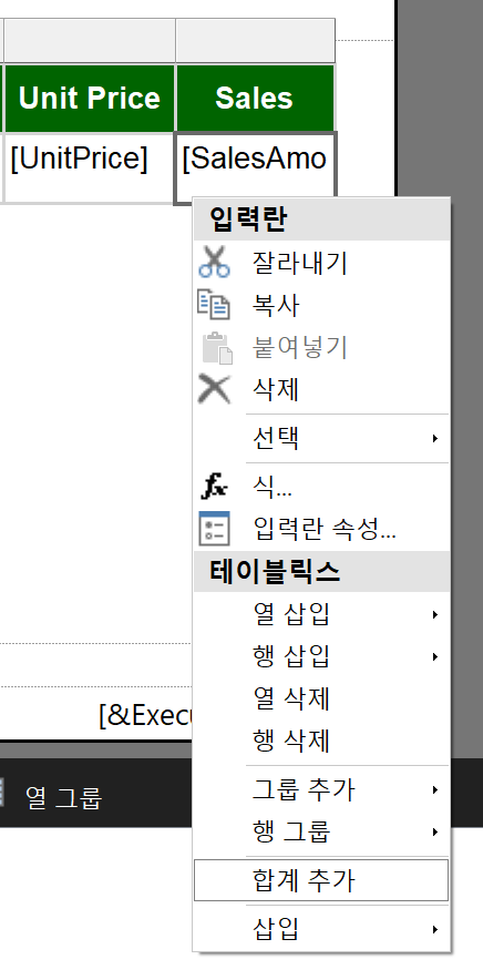 그럼 어느정도 디자인이 되었고, 합계 행을 추가해보겠습니다. SalesAmount 데이터 필드의 모서리가 선택되도록 하여 마우스를 오른쪽 클릭하면 [합계 추가]를 클릭할 수 있습니다. 데이터 형식과 열의 넓이 등을 수정합니다.