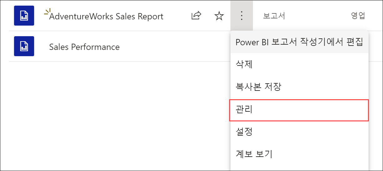 게시하고 나서 게이트웨이, 보고서의 연결 정보 등을 핸들링해주어야 합니다. Power BI 서비스로 이동하여 해당 보고서의 … 을 클릭하여 [관리]를 클릭합니다.