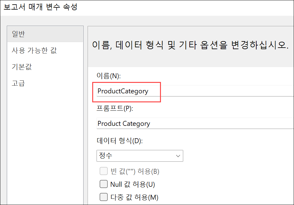 먼저 보고서 작성기에서 매개 변수의 이름과 데이터 형식을 확인합니다.