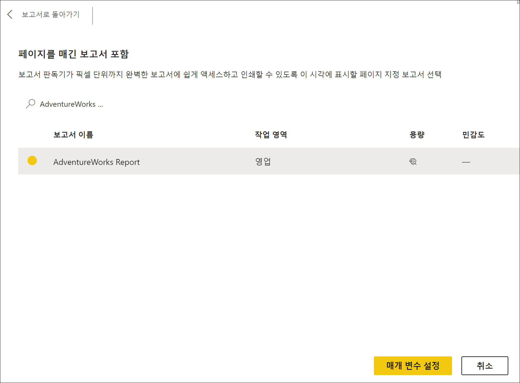 [보고서에 연결]을 클릭하여 원하는 페이지를 매긴 보고서를 선택하고 [매개 변수 설정]을 클릭합니다.