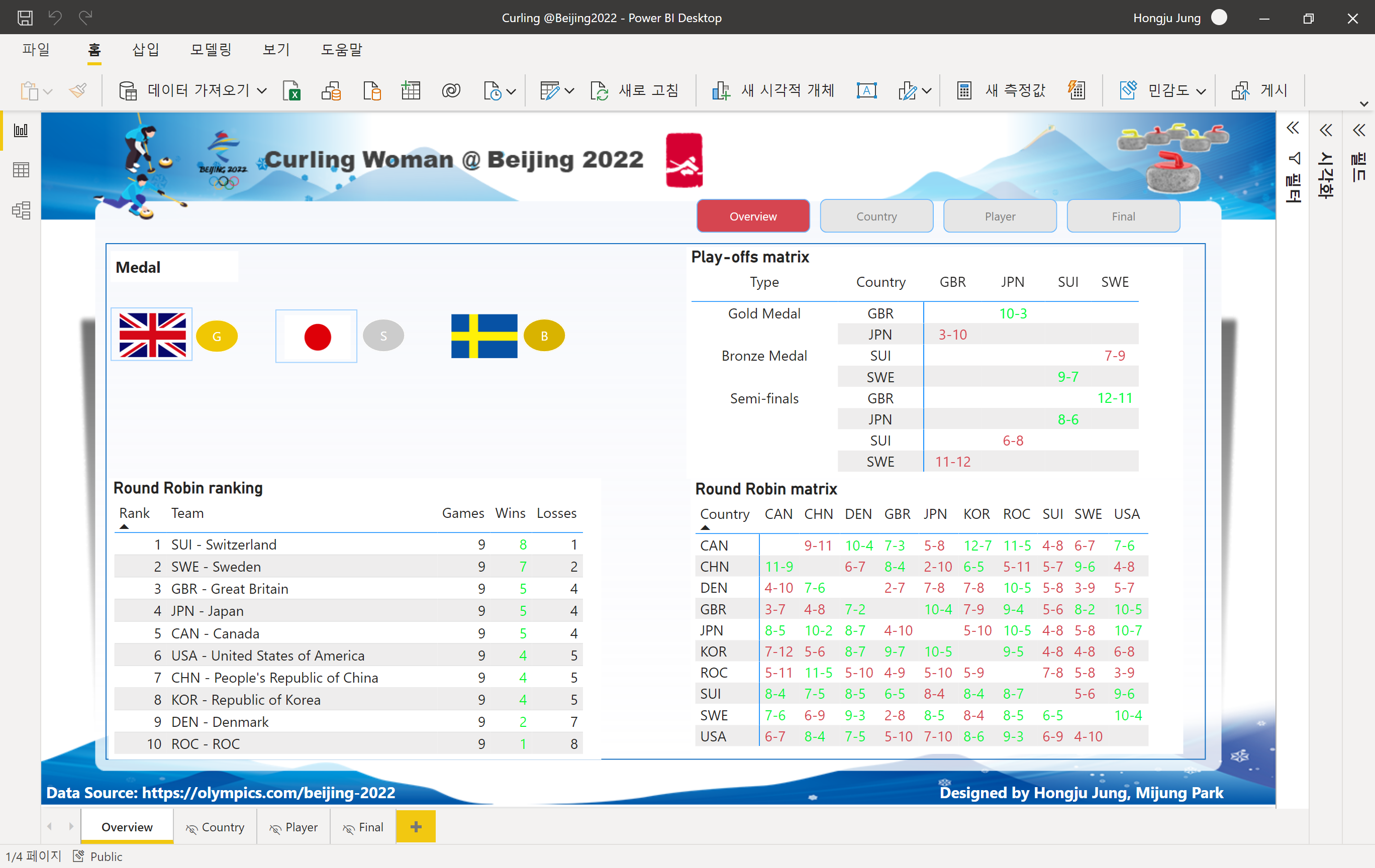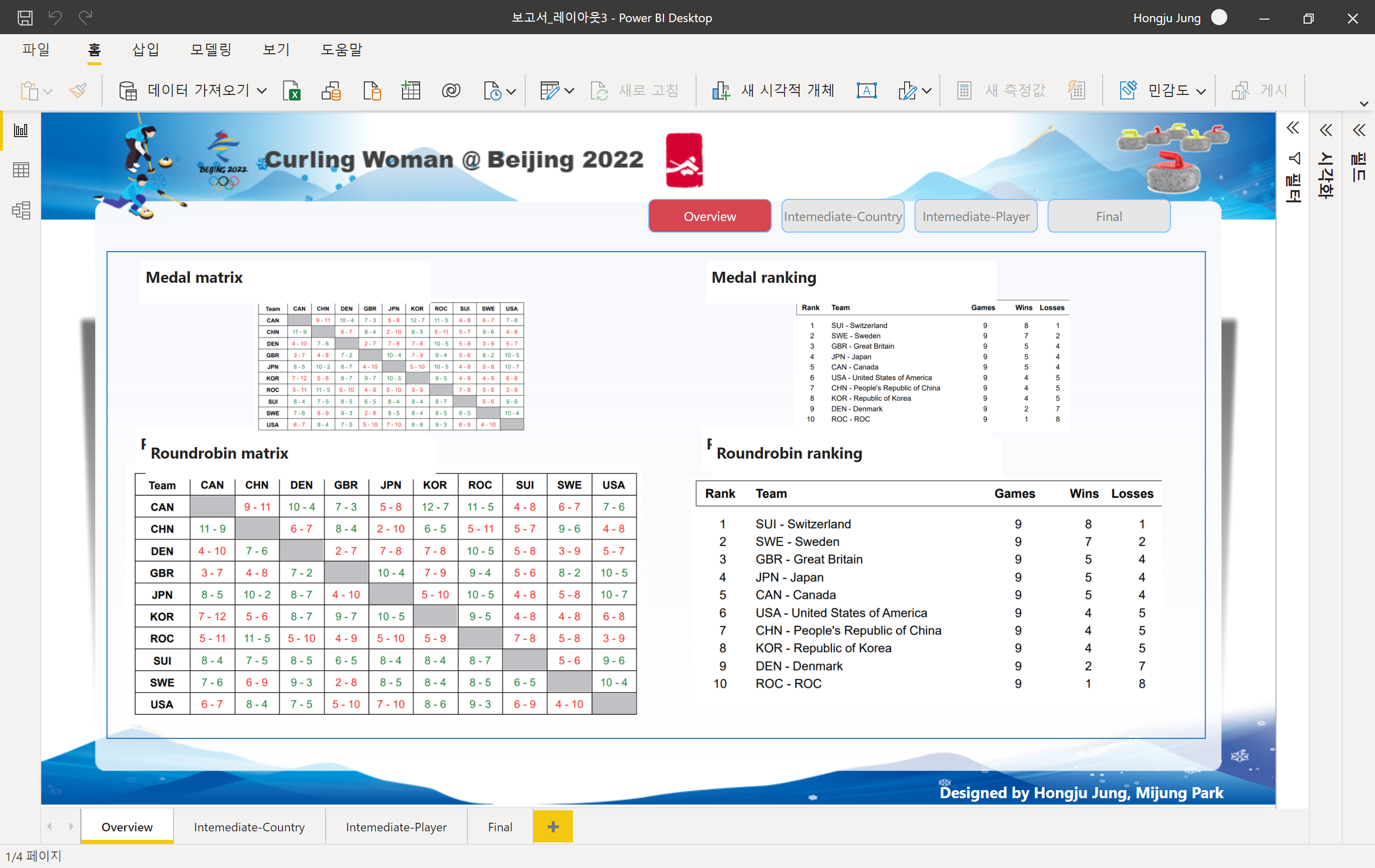 최근에 진행했던 보고서 작업 진행 히스토리를 한번 살펴보겠습니다. 동계 올림픽 여자 컬링에 대해 시각화를 해보려고 커피숍에 모여 얘기를 나누면서 간단히 스케치를 했습니다. 이때는 데이터도 없고 대략적인 계획을 했습니다.