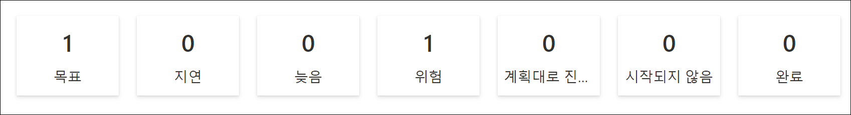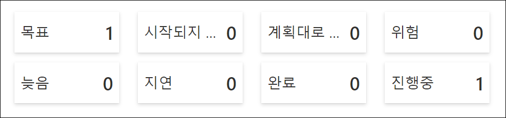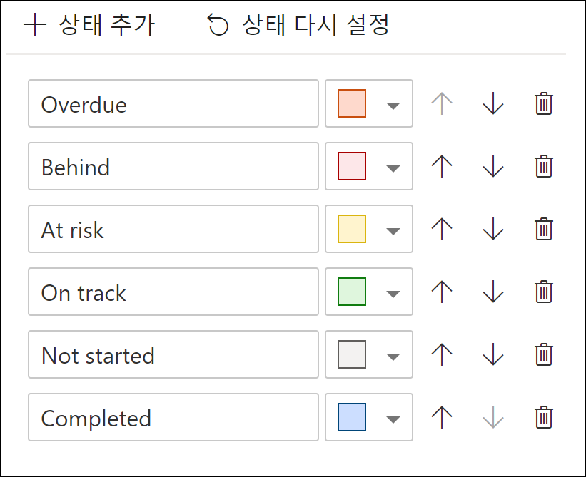 기본상태 값은 6개(지연, 늦음, 위험, 계획대로 진행중, 시작되지 않음, 완료)지만, 추가로 6개까지 총 12개 상태 값을 추가하거나 수정할 수 있습니다.
