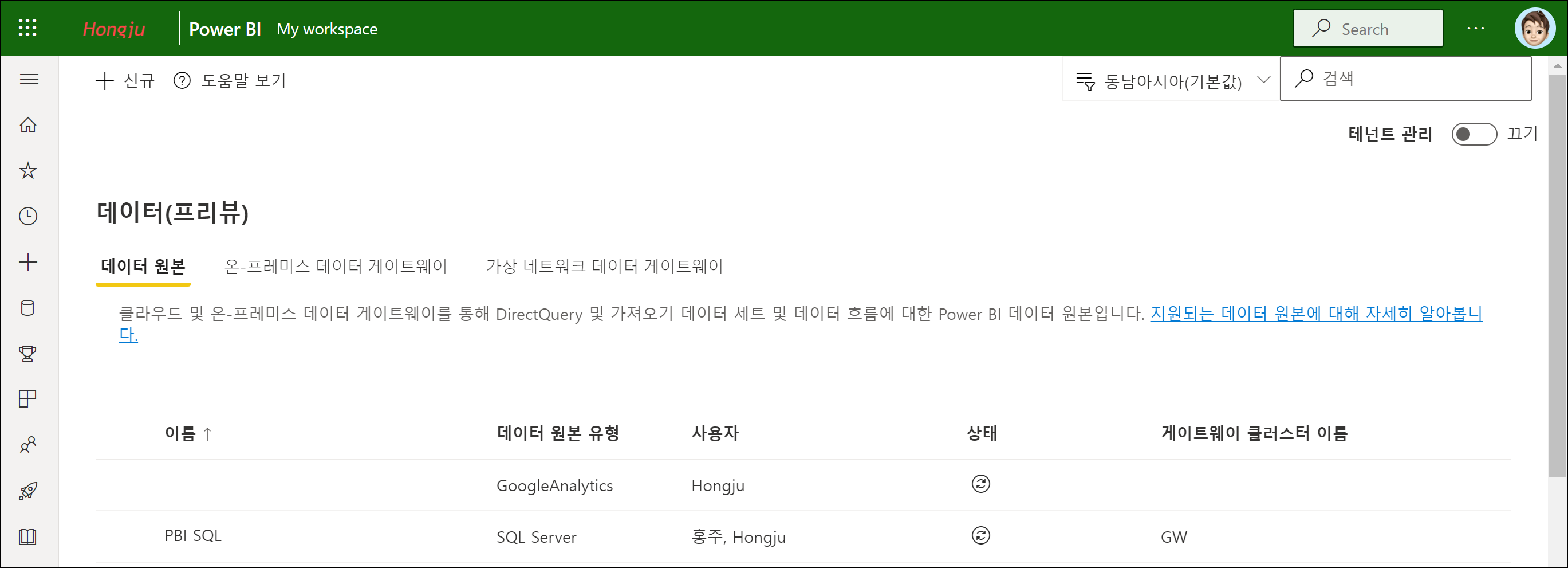 Power BI 포털에서 [게이트웨이 관리]로 들어오면 게이트웨이 관리 환경(미리 보기)를 확인할 수 있습니다.
