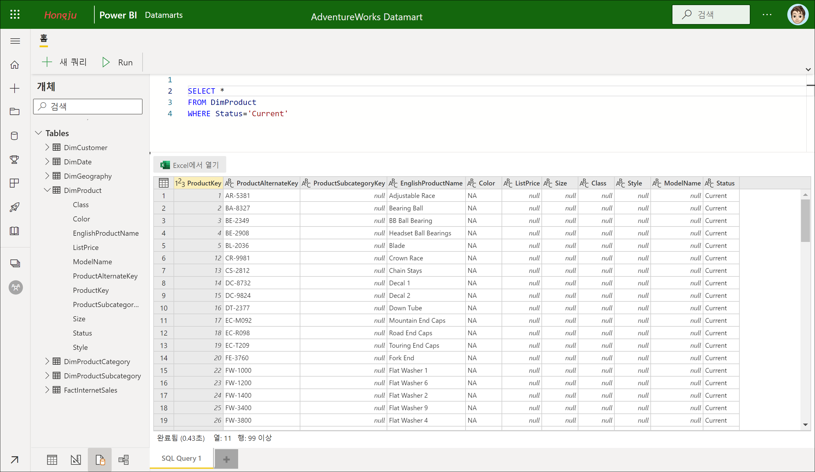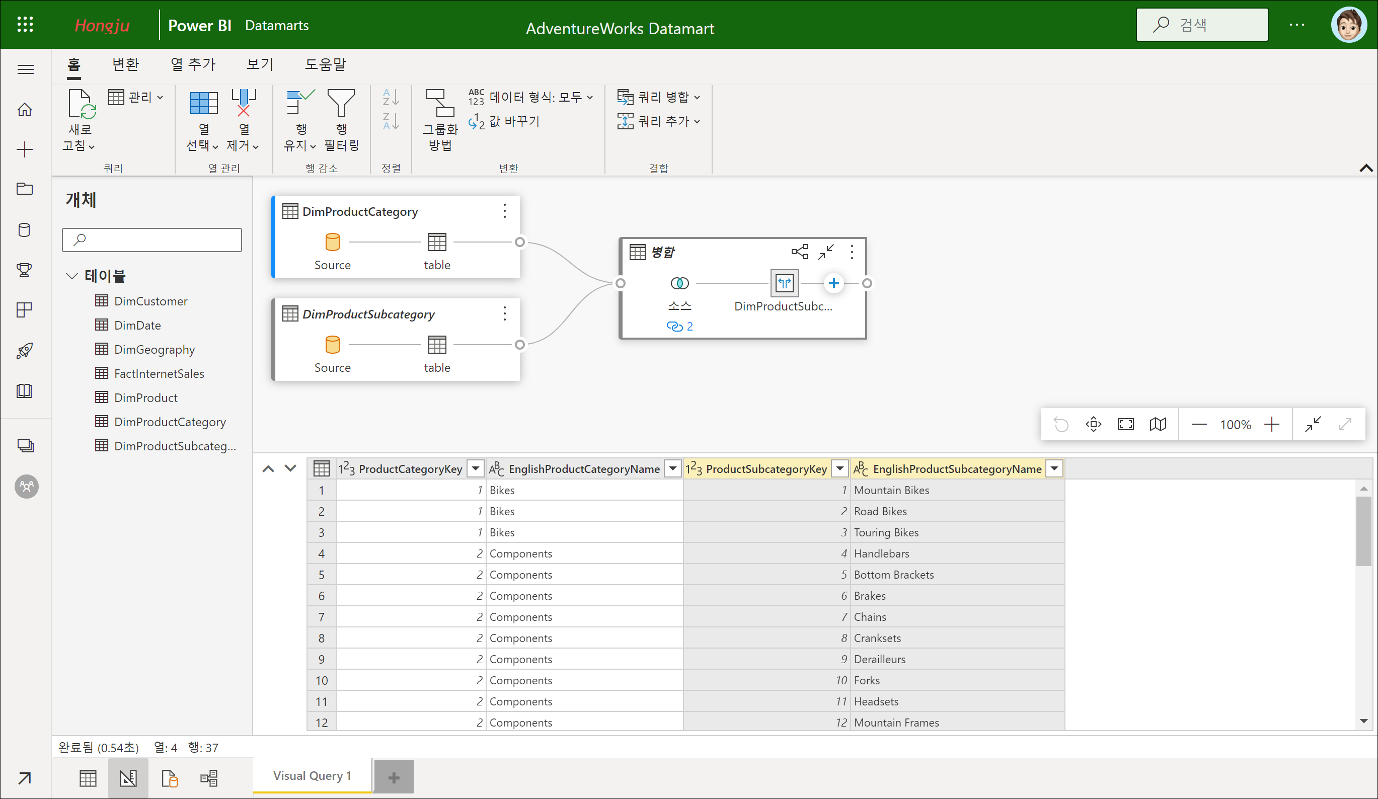 간략히 데이터 마트의 관계와 쿼리를 확인해보았습니다. Power BI Desktop의 모델 탭에서 관계와 Power Query 편집기의 쿼리 추가, 병합과 거의 유사하다는 것을 확인해보았습니다.