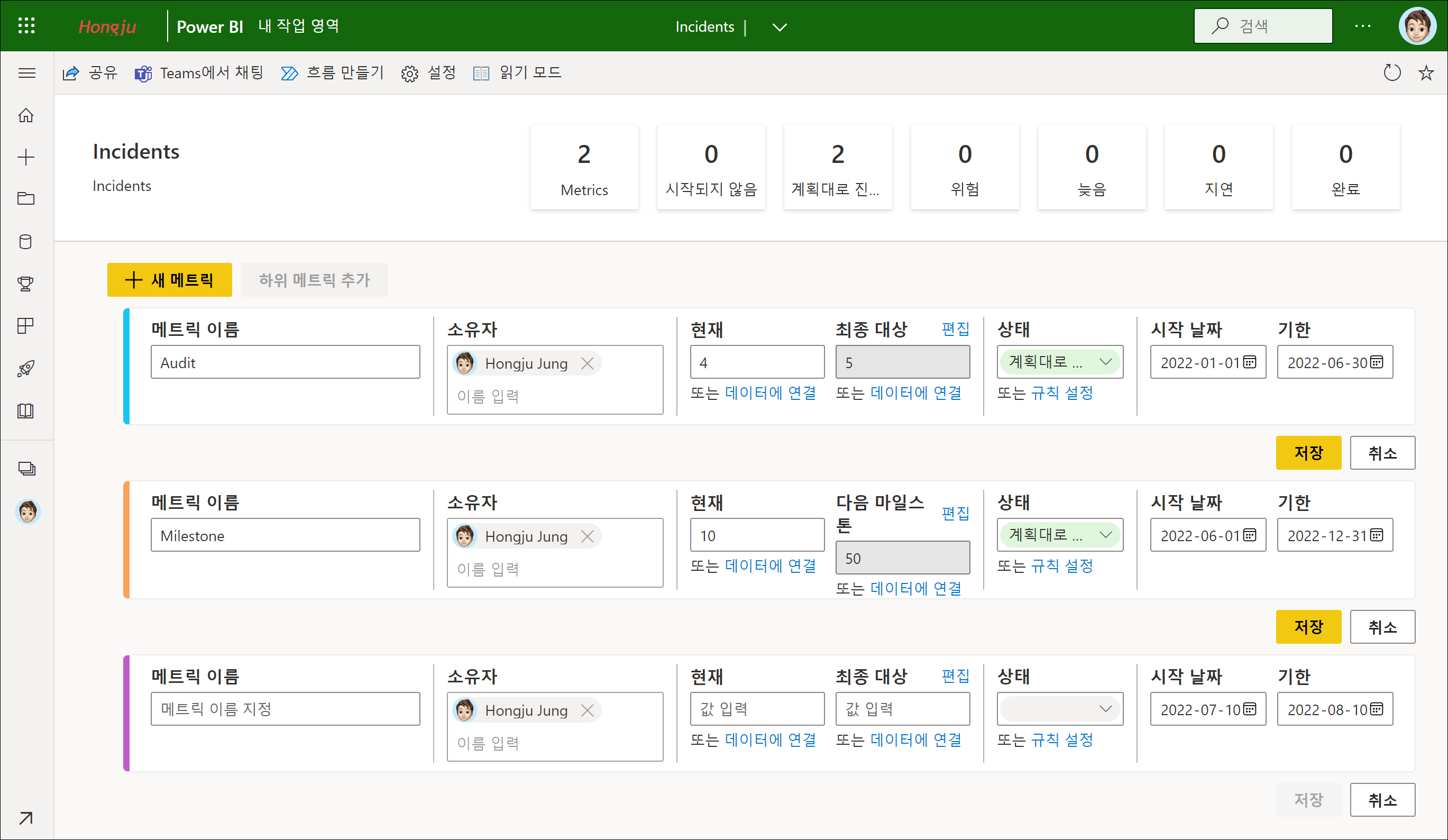 목표 값을 설정할 때 몇 가지 애로 사항이 있었습니다. 예를 들면, 목표 값이 분기별로 바뀌게 되면 매번 변경해야만 합니다. 이런 경우 마일스톤으로 해결할 수 있습니다. 메트릭을 편집 상태로 변경하고 최종 대상에서 [편집]을 클릭합니다.