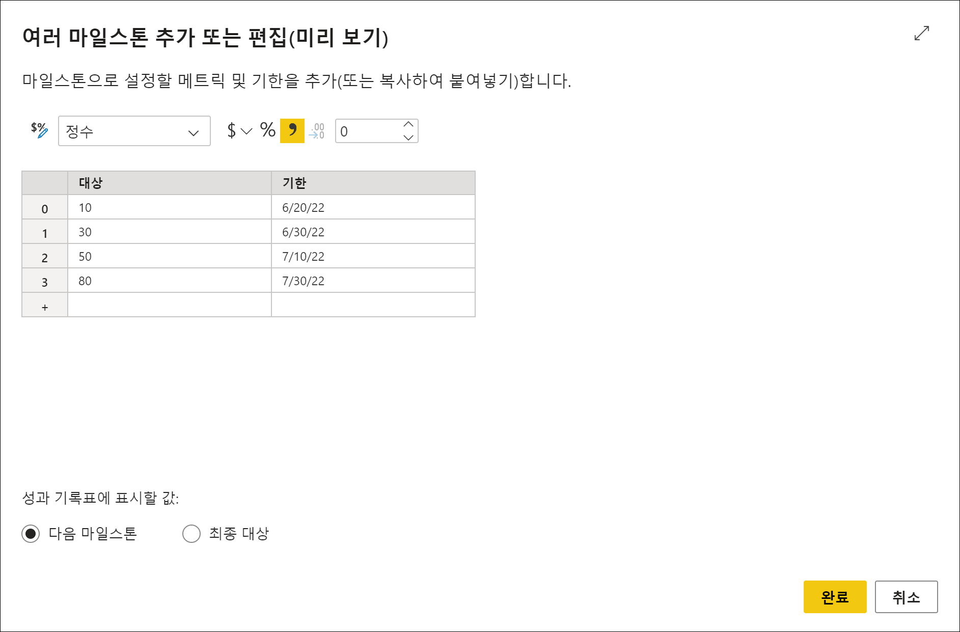 그러면 [여러 마일스톤 추가 또는 편집]을 볼 수 있고, 성과 기록표에 표시할 값을 선택할 수 있습니다. 분기별로 목표 값이 바뀐다면 분기별 대상 값을 추가해주면 됩니다. 성과 기록표에 표시할 값으로 [다음 마일스톤]을 선택하게 되면 해당하는 날짜에 대한 값이 메트릭에 표시됩니다. 마일스톤에 따라 바뀌게 되므로 관리하기가 더 효과적입니다.