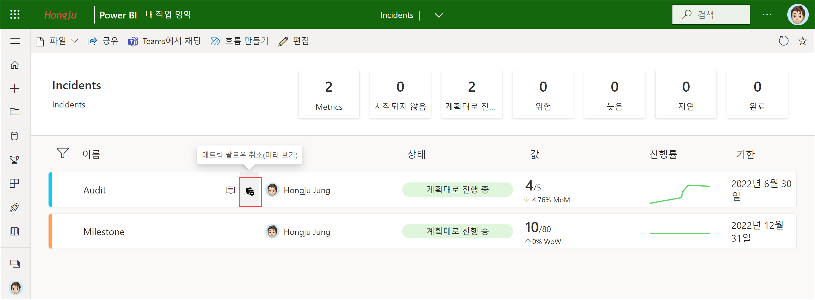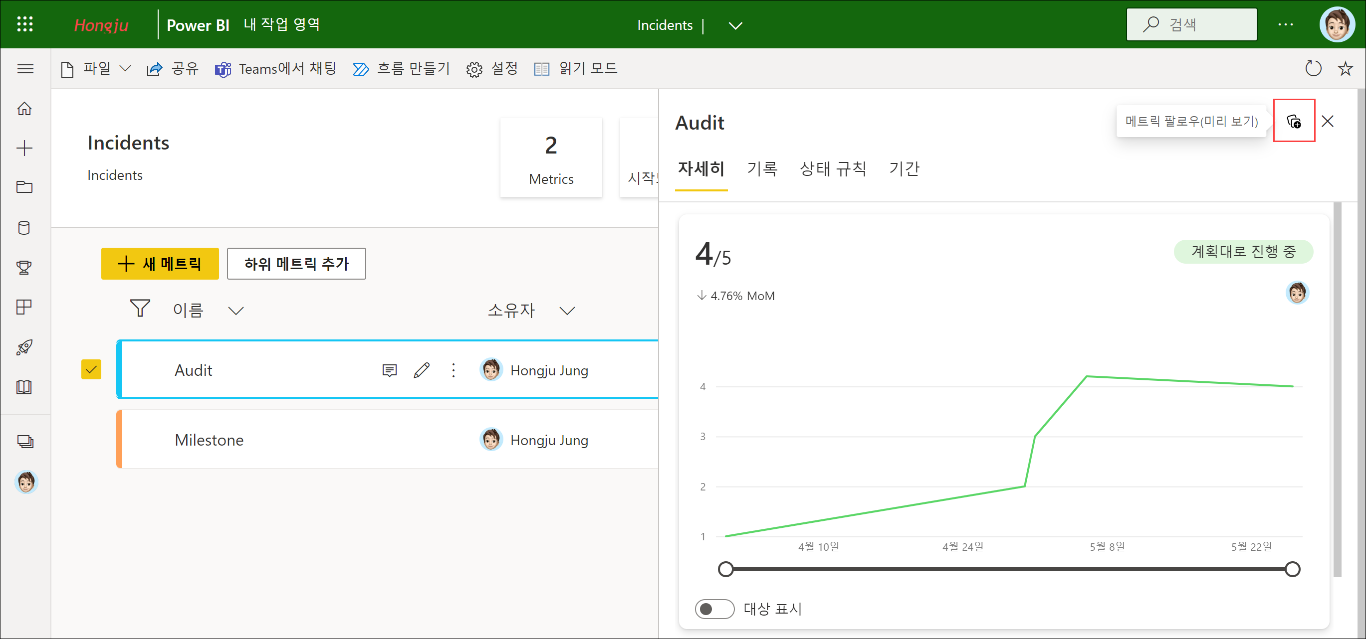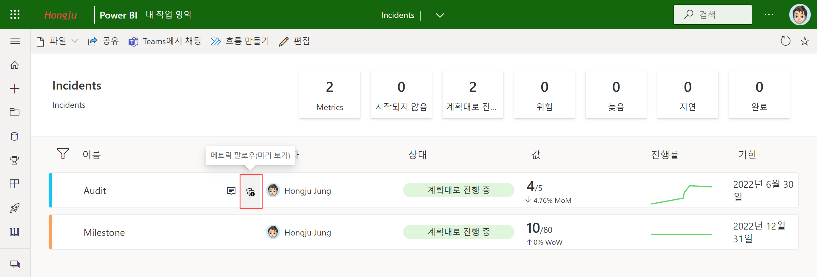 팔로우 하는 방법은 성과기록표를 클릭하여 메트릭 위에 마우스를 올리면 팔로우 아이콘을 볼 수 있습니다.