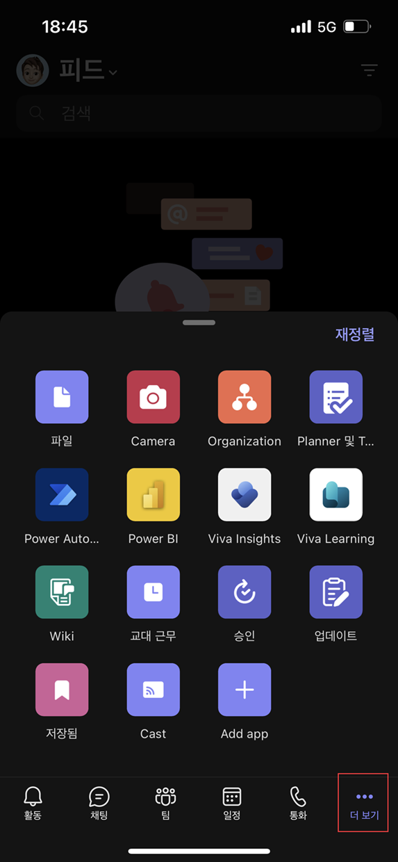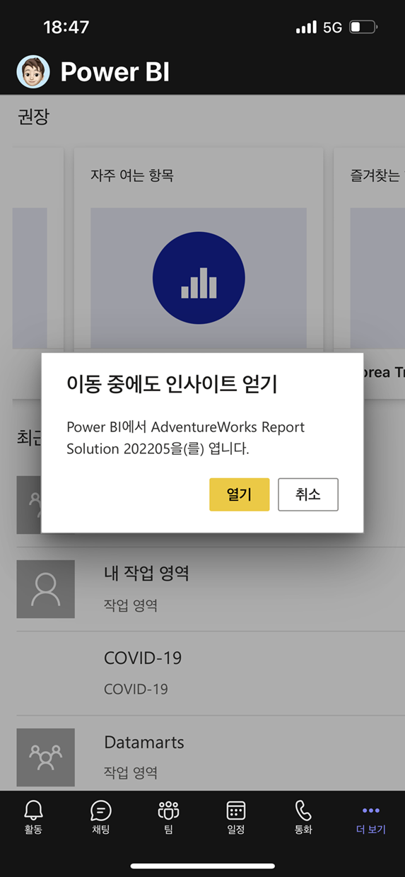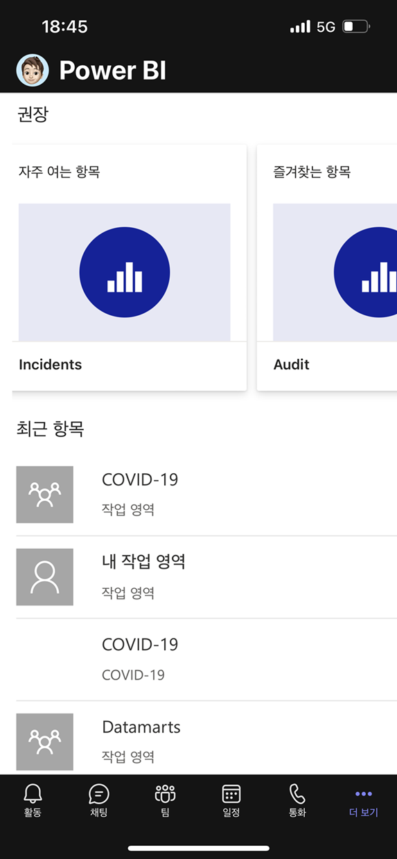 Teams 모바일 앱에서 Power BI 앱과 연계할 수 있습니다. Teams에 Power BI 앱을 설치하고 나서 Teams 모바일 앱을 열어 더 보기를 클릭하면 Power BI 앱 메뉴를 모바일에서도 확인이 가능합니다.