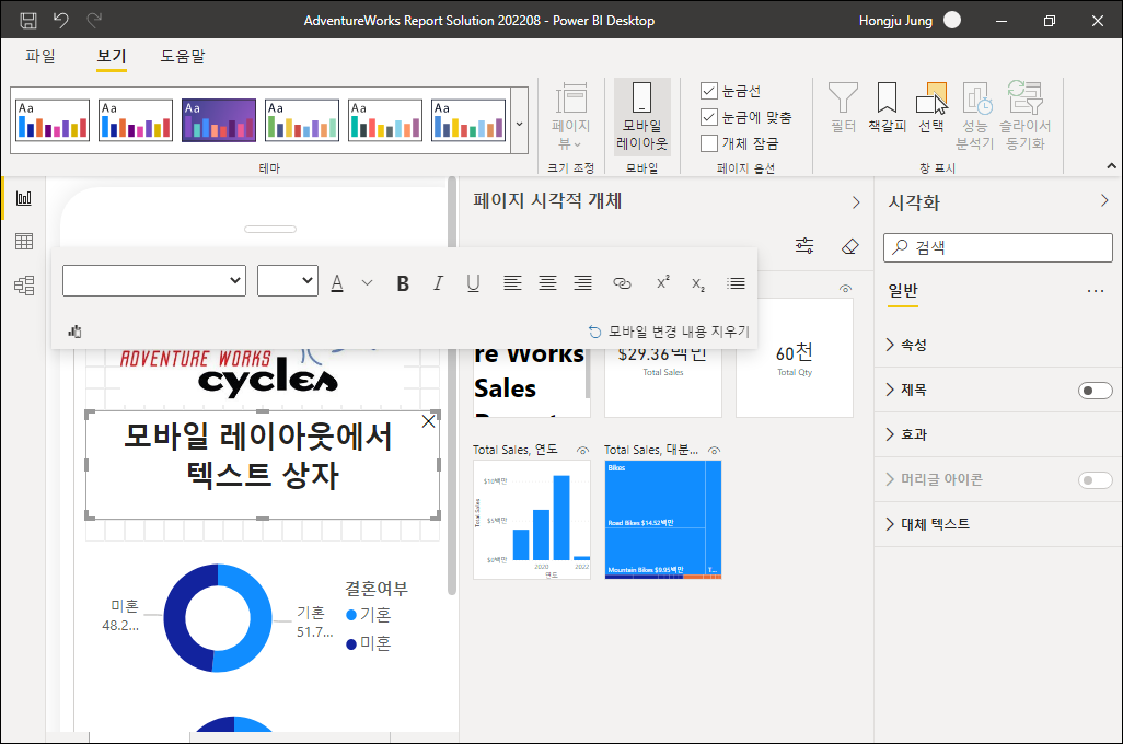 보고서에 텍스트 상자가 있을 경우 모바일 레이아웃에서 캔버스에 텍스트 상자를 추가하고 서식을 변경할 수 있습니다.