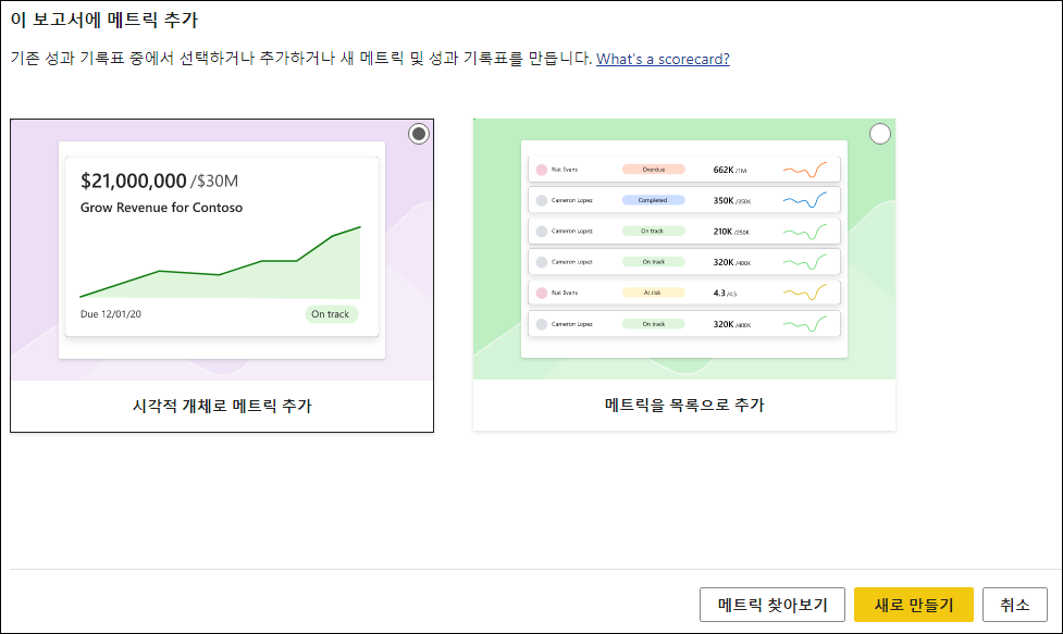 메트릭 시각적 개체를 추가하게 되면 다음과 같이 시각적 개체 또는 목록으로 추가하거나 새로 만들기하여 추가할 수 있는 것을 확인할 수 있습니다.