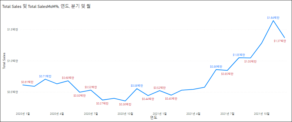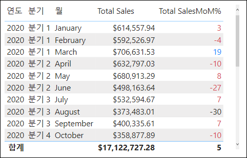조건부 서식은 그라데이션, 규칙, 필드값을 통해 적용이 가능합니다. 여기서는 규칙을 통해 지정했습니다. 데이터 레이블에 조건부 서식이 지정된 것을 확인할 수 있습니다. 전년도 대비 변화가 특정값 이하이면 빨간색으로 나타나게 규칙을 적용했습니다.