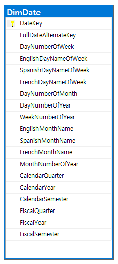 날짜 테이블을 중앙에서 구성한다면 아래의 예와 같은 스키마로 여러 보고서에서 이용할 수 있도록 구성하면 효과적입니다. Calendar, Fiscal을 하나의 테이블에 같이 구성하면 회계연도로 보는 부서도 이용 가능합니다. 사전 요구사항을 파악해서 진행해야 합니다.