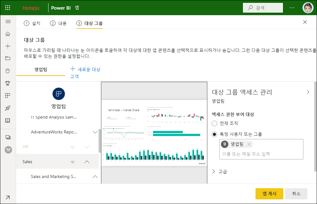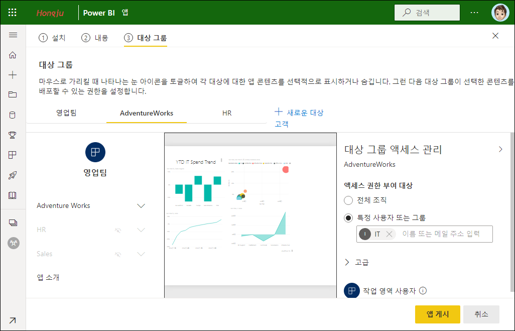 Power BI 앱을 위한 여러 대상 그룹에 대한 내용이 업데이트 되었습니다. 앱을 게시하게 되면 특정 그룹에 1:1로 매치됩니다. 앱에 여러 보고서가 있다면 모든 보고서가 특정 그룹에 다 보이게 됩니다. 보고서별로 그룹을 다르게 하려면 앱을 여러 개 만들어야 하는 부담이 있었는데요.