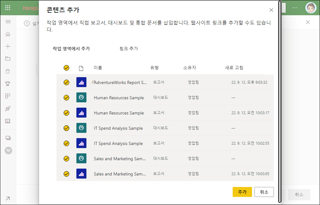 작업 영역에서 [앱 만들기]를 선택하여 내용으로 이동하면 [콘텐츠 추가]를 확인할 수 있습니다.. [콘텐츠 추가]를 클릭하여 앱에 표시할 콘텐츠를 추가합니다.
