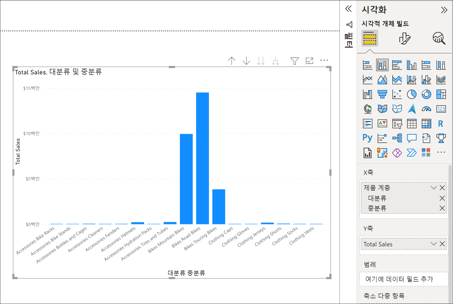 먼저 x축 계층 기본 지원을 확인해보겠습니다. 이전 버전에서는 x축에 계층 필드를 추가하고 나서, 드릴온하여 수준을 내려서 표시하였습니다. 아래는 이전 버전에서 x축에 계층 필드를 추가한 이미지입니다.