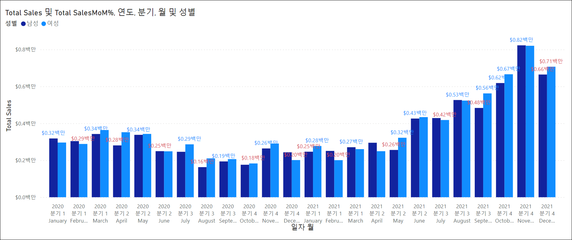 이번 업데이트에서는 계층 필드를 x축에 배치하면 수준이 내려가서 시각화되며, 정렬은 기본적으로 계층 필드를 기준으로 정렬됩니다.