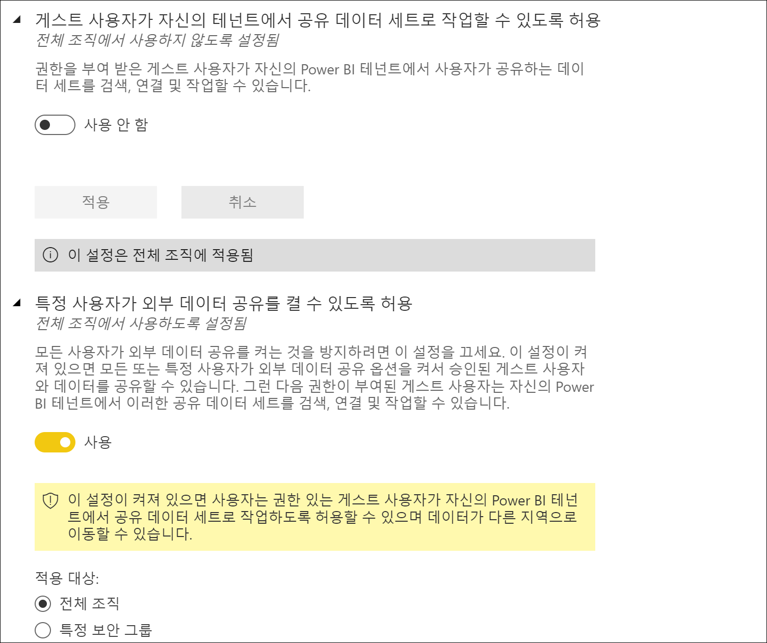 교차 테넌트 데이터세트 공유를 위해 테넌트 설정에서 ‘특정 사용자가 외부 데이터 공유를 켤 수 있도록 허용’ 설정을 확인할 수 있습니다.