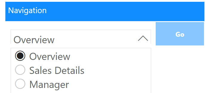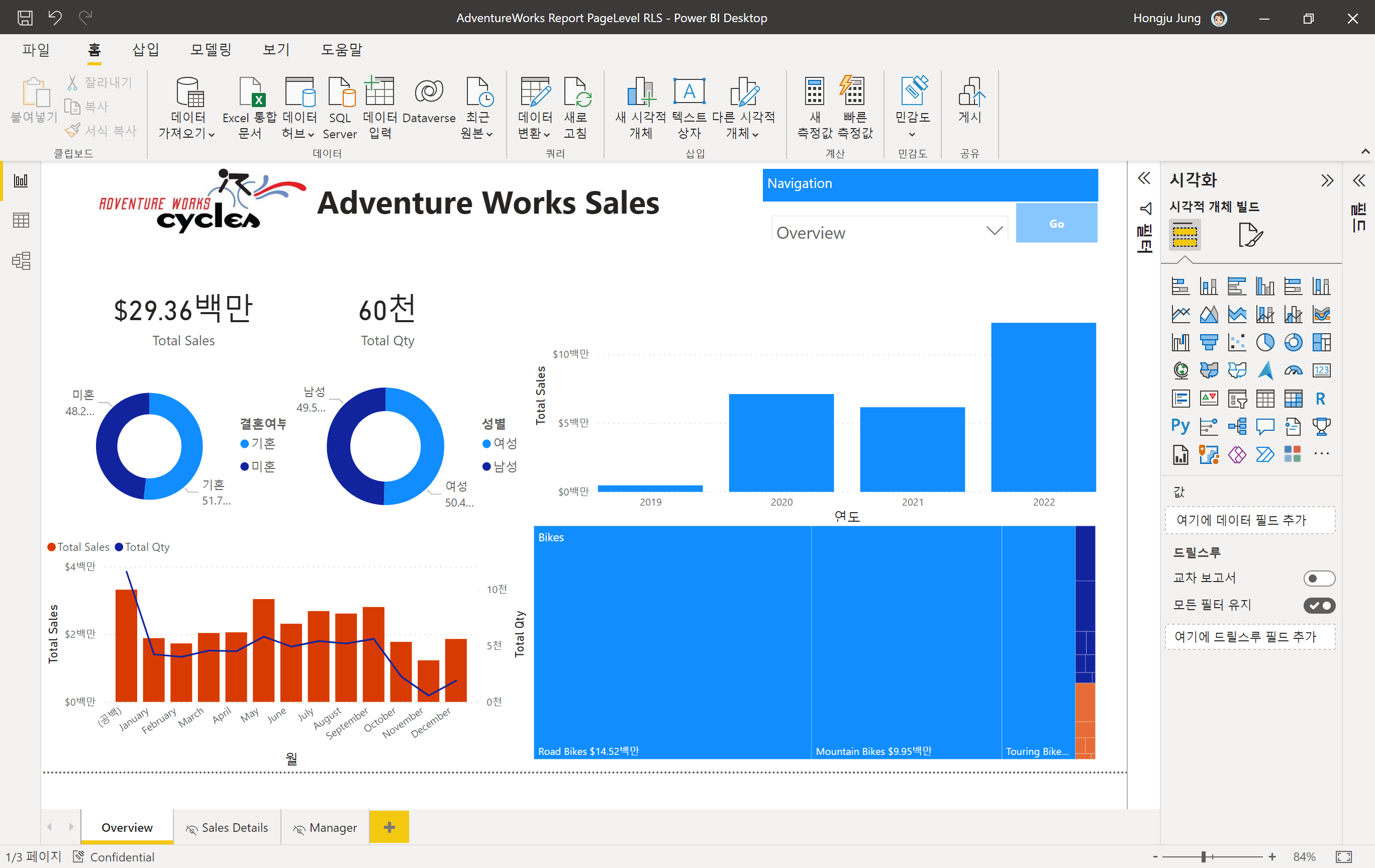 저는 Overview, Sales Details, Manager 3개의 페이지를 가지고 있고 Overview 페이지만 보이게 하고 다른 페이지들은 숨김처리되어 있습니다. 오른쪽 상단에 페이지로 이동할 수 있는 탐색 부분을 추가했습니다.