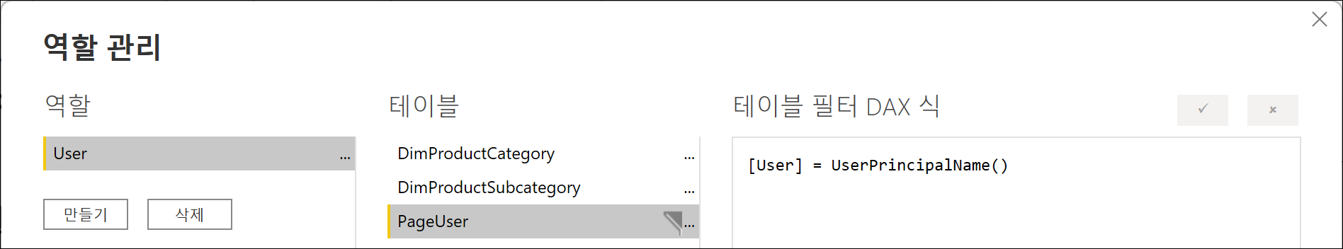 행 수준 보안을 위해 역할을 생성하여 페이지를 볼 수 있는 권한 테이블을 UserPrincipalName()을 통해 필터링합니다.
