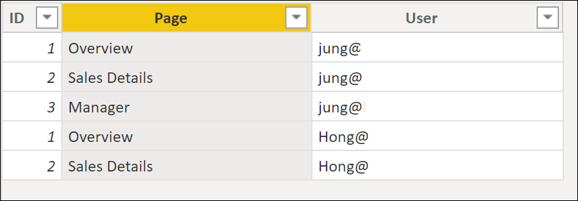 페이지를 볼 수 있는 권한 테이블은 아래와 같이 구성되어 있습니다. 이 테이블의 페이지 이름을 탐색 슬라이서에 데이터 바인딩했습니다.