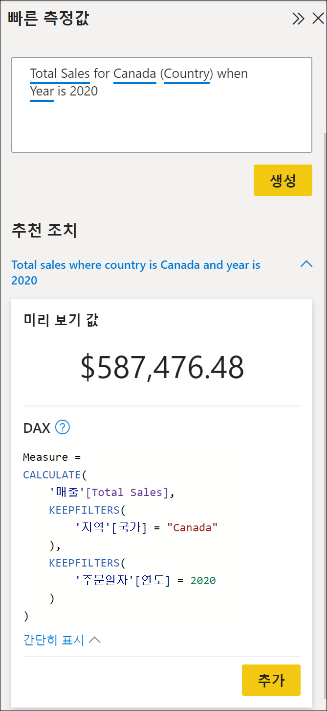 영어로 질문을 던지면 아래와 같이 DAX 측정값 수식을 확인할 수 있습니다. [추가]를 클릭하면 측정값이 생성되며, 필요시 수정할 수 있습니다. 아직은 미리 보기이며, 날짜 컬럼 등을 수정해야 할 수 있습니다.