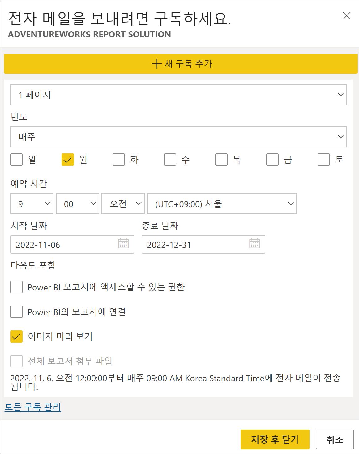 다음은 일반 작업 영역에 대한 구독입니다. 해당 보고서로 이동하여 … 메뉴의 [구독]을 클릭합니다. 구독에서 받을 사람, 시간, 요일 등을 선택합니다. 일반 작업 영역에서는 이미지 미리 보기를 선택할 수 있습니다 (소유자일 경우 다른 사람을 추가할 수 있습니다)
