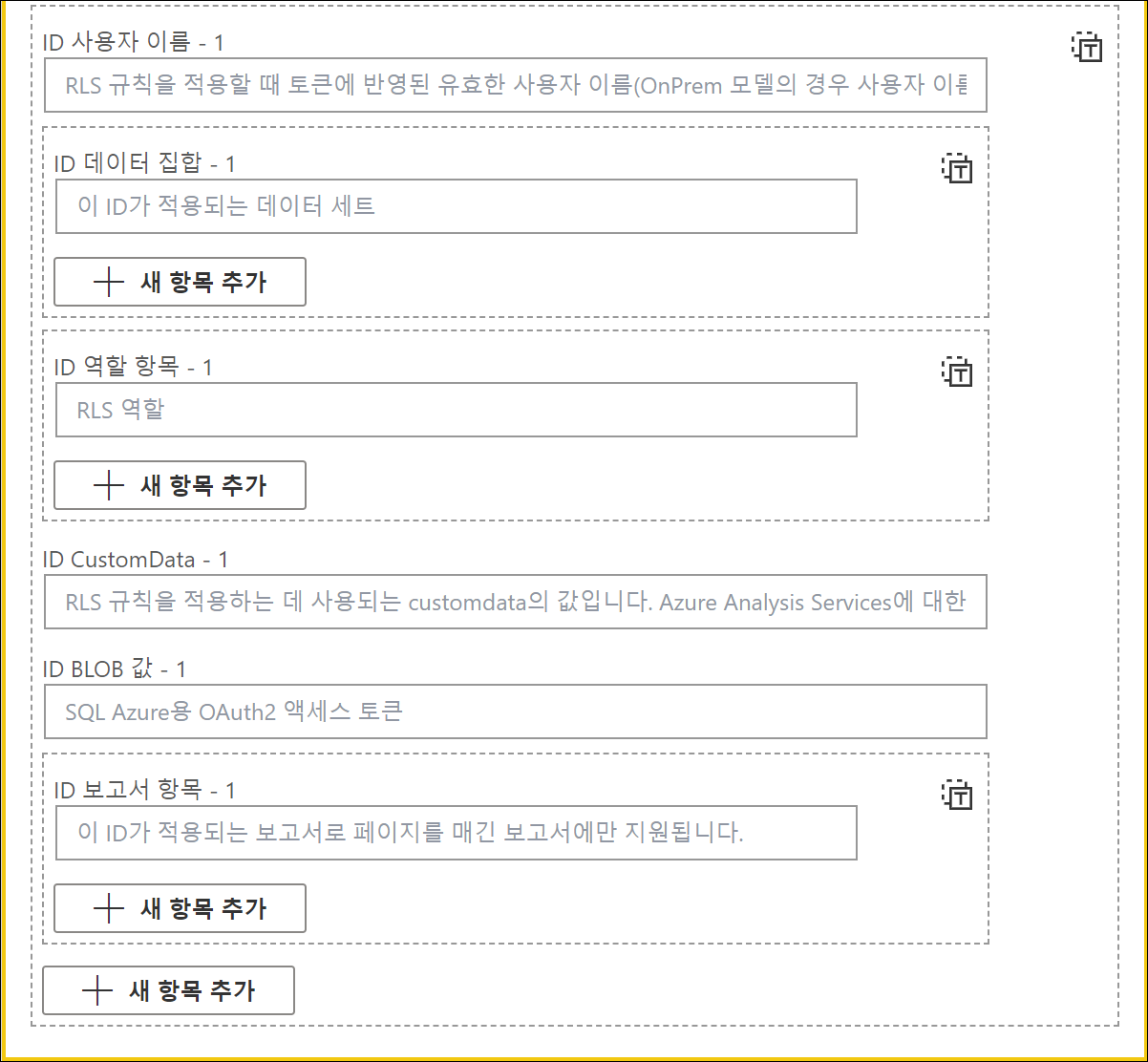 세부적인 속성으로는 보고서 수준 필터, 페이지, 행 수준 보안 등에 대한 내용이 있습니다.