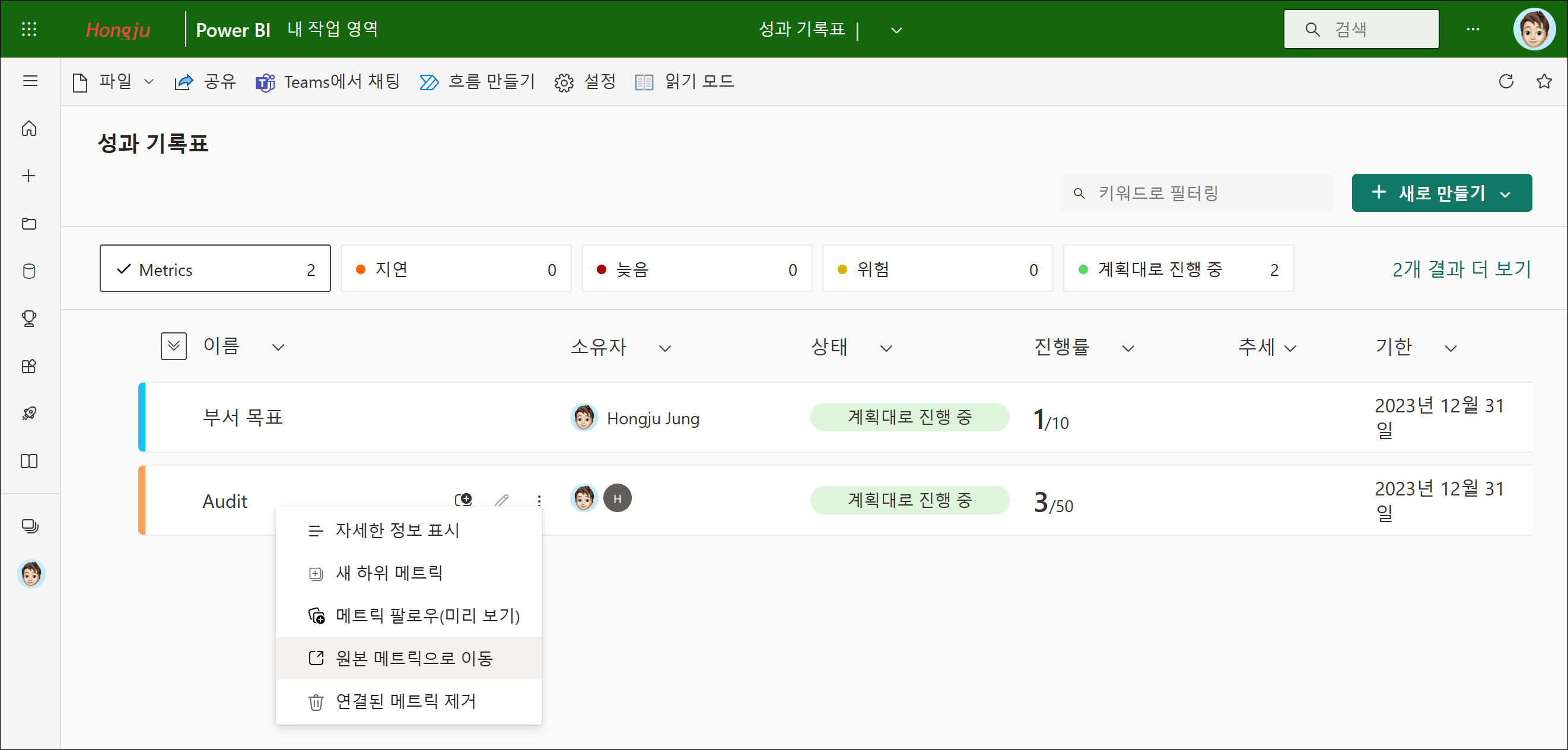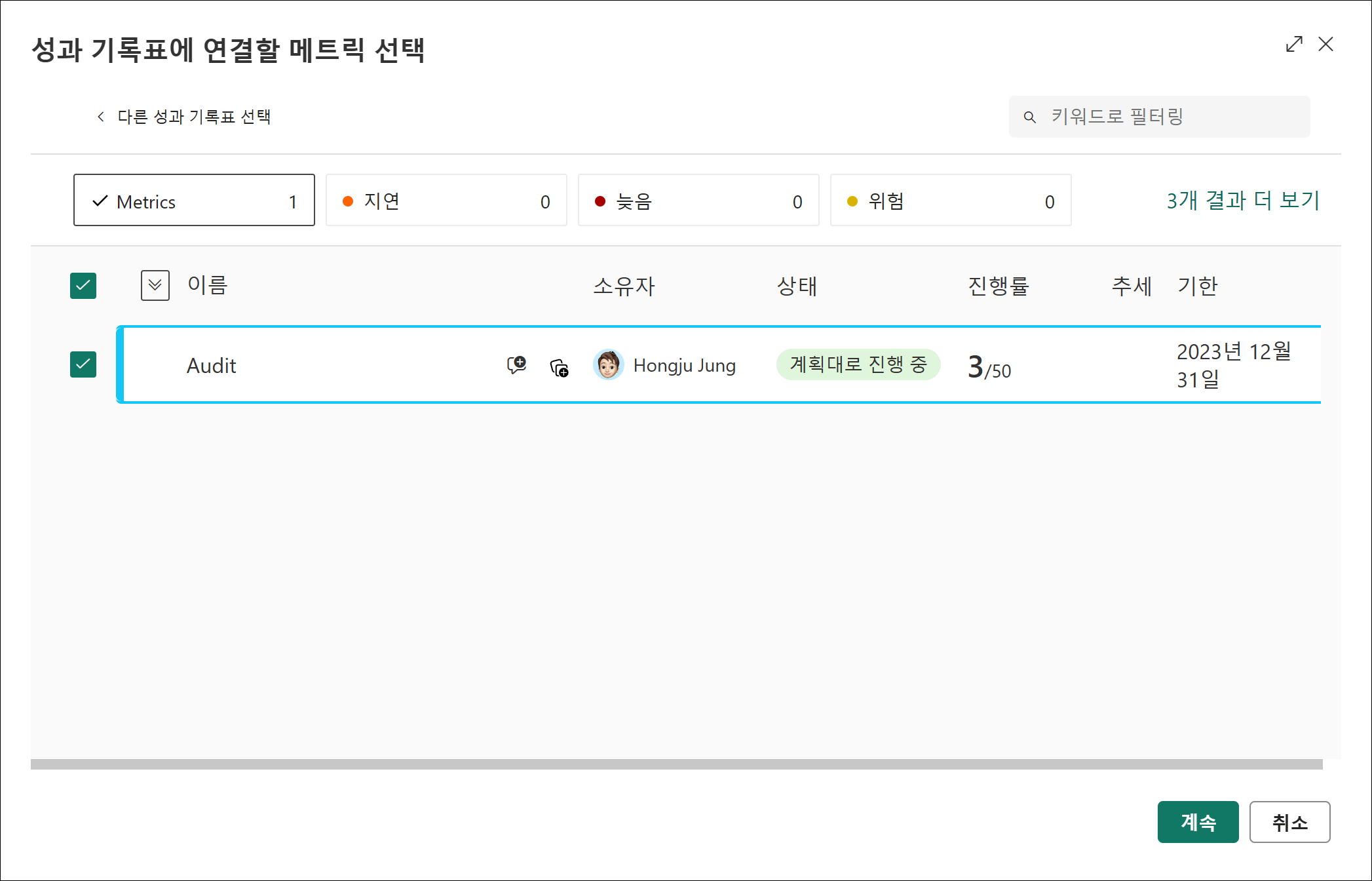 그럼 성과 기록표에 메트릭이 연결되어 추가됩니다.