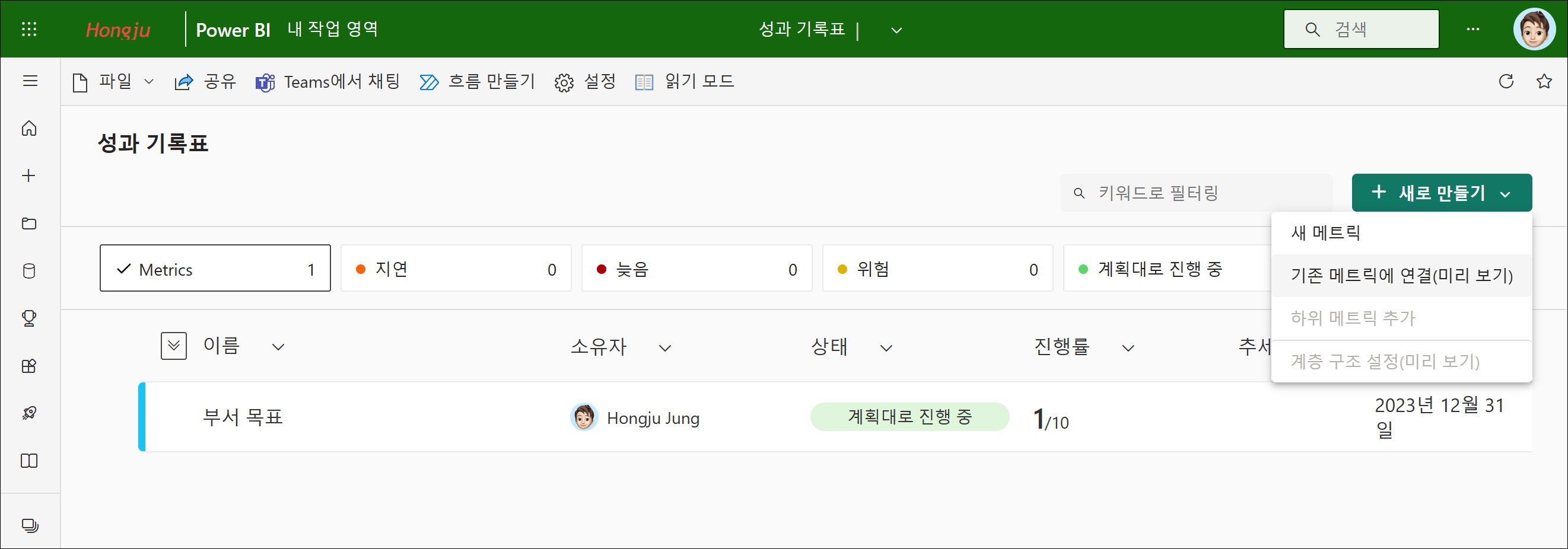 성과 기록표에서 기존 메트릭을 연결하여 추가해보겠습니다. 추가할 성과 기록표로 이동하여 편집 버튼을 클릭하고, 새로 만들기 버튼을 드롭다운해보면 ‘기존 메트릭에 연결’을 확인할 수 있습니다.