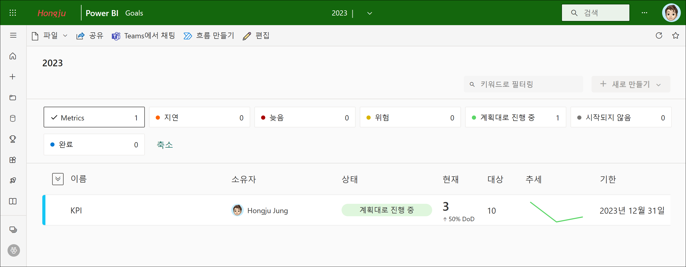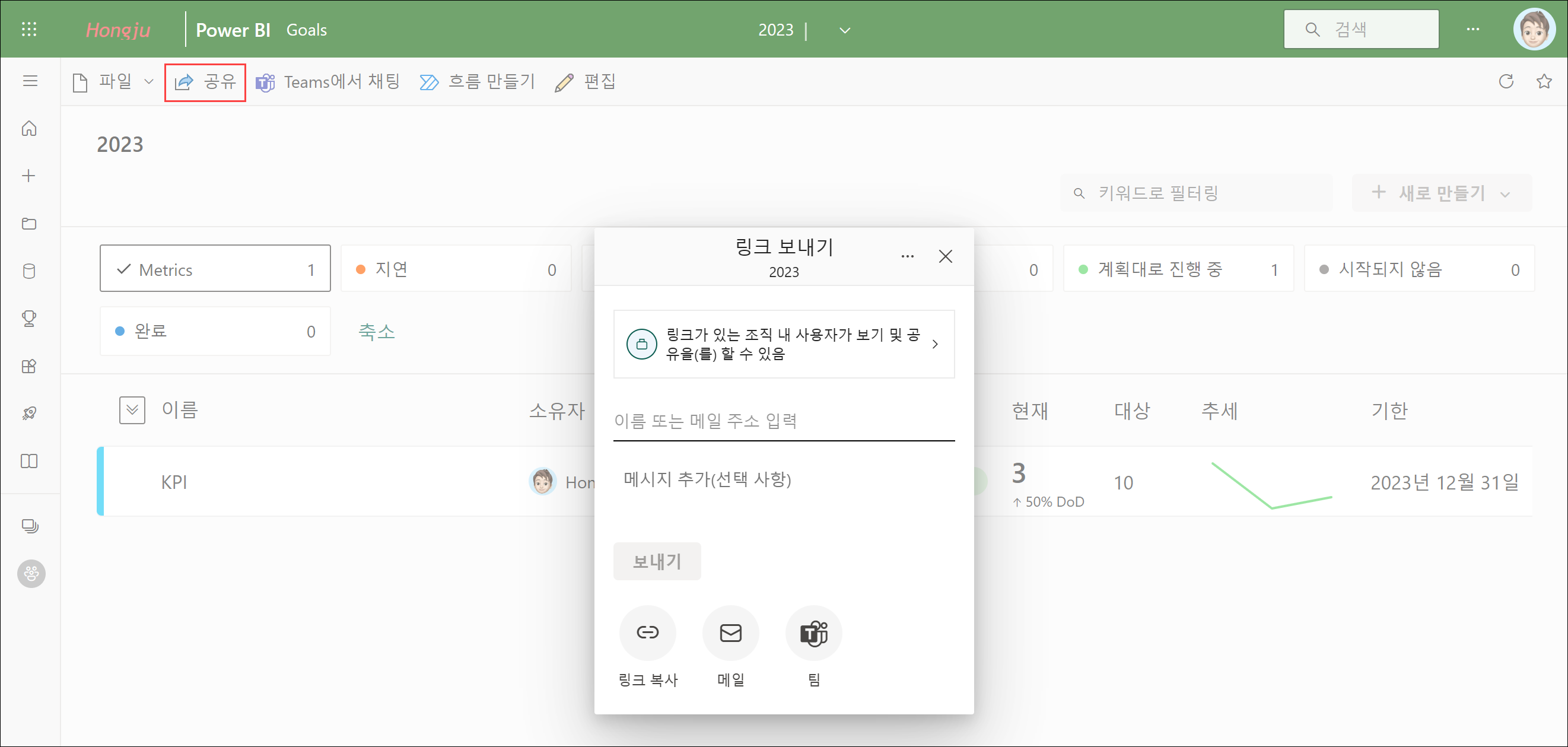먼저 메트릭을 다른 사람과 공유하는 등의 작업이 필요하므로 Power BI Pro 라이선스가 필요합니다.