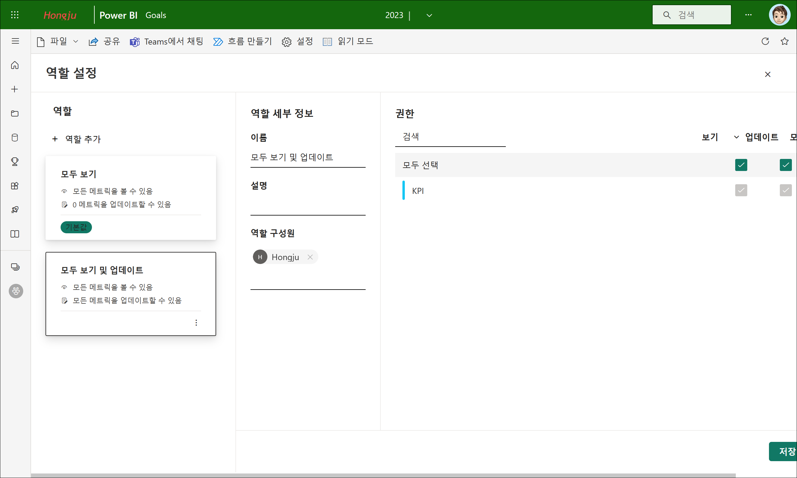 사용 권한을 설정하려면, 메트릭의 설정을 클릭하고 사용 권한 탭에서 기존 역할을 클릭하거나 역할 추가를 클릭하면 됩니다.