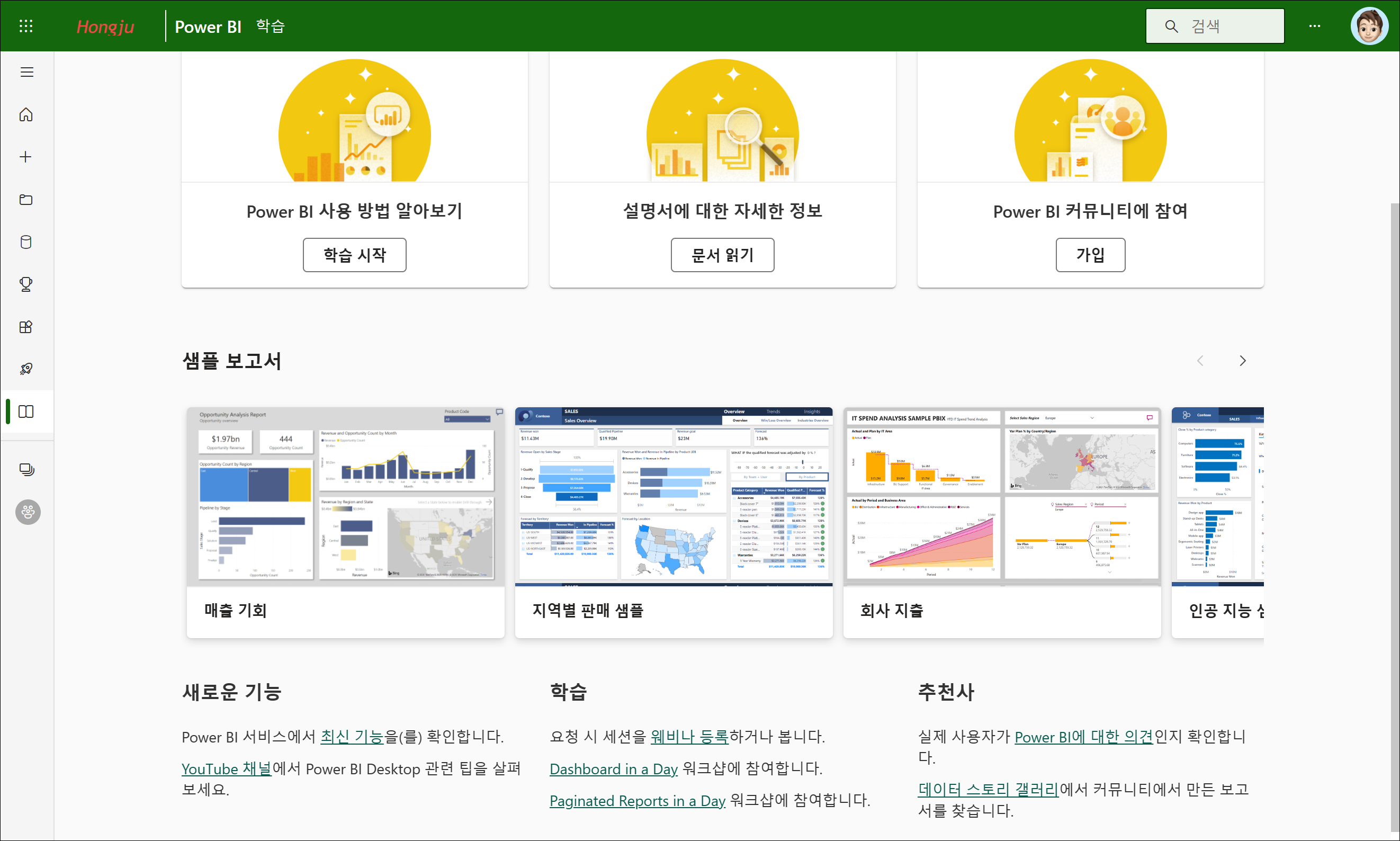 왼쪽 탐색 메뉴에서 ‘학습’을 클릭하게 되면, 내 작업 영역에 보고서가 생성됩니다. 다른 작업 영역에 생성하려면, 새 샘플 보고서를 다운로드하여 해당 작업 영역에 업로드하면 됩니다.