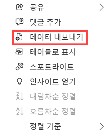 먼저 Power BI 서비스에서 시각적 개체의 추가 옵션을 보면 [데이터 내보내기]를 확인할 수 있습니다. 데이터 검증 작업을 하는 경우에도 [데이터 내보내기]를 통해 확인하면 효과적입니다.