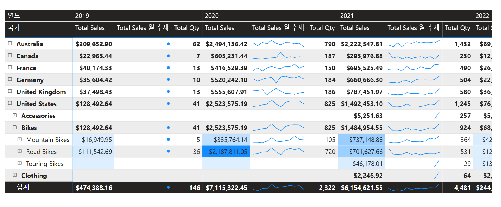 조건부 서식과 스파크 라인을 적용한 행렬 시각적 개체를 옵션별로 내보내기 결과를 확인해보겠습니다.