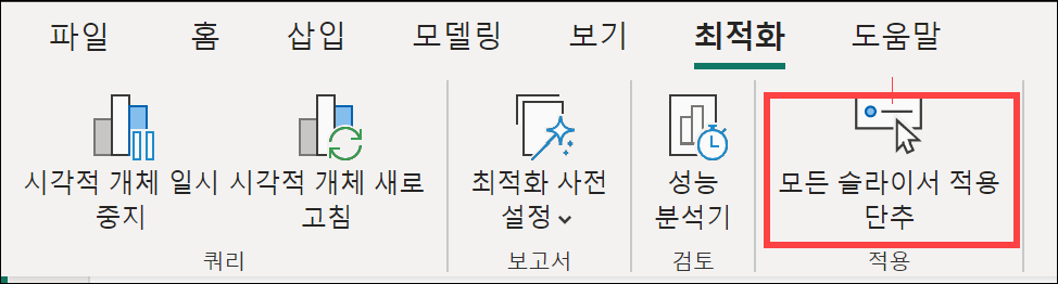 모든 슬라이서 적용 단추는 Power BI Desktop의 [최적화] 탭에 있습니다.
