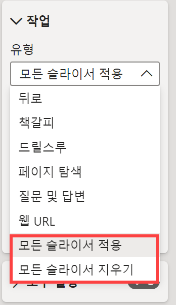 모든 슬라이서 적용 단추의 서식 > 작업에 보면 ‘모든 슬라이서 적용’, ‘모든 슬라이서 지우기’를 확인할 수 있습니다.