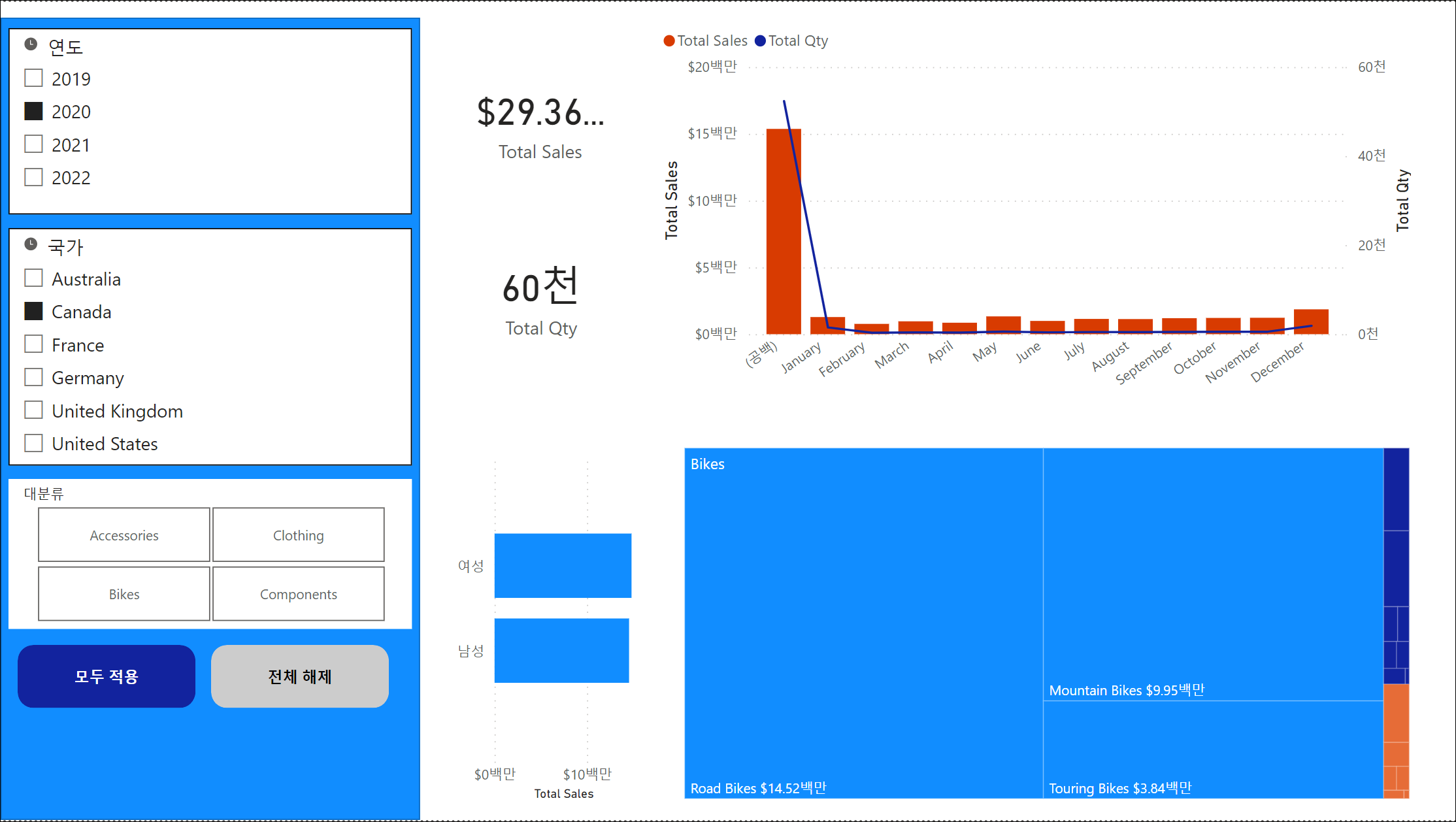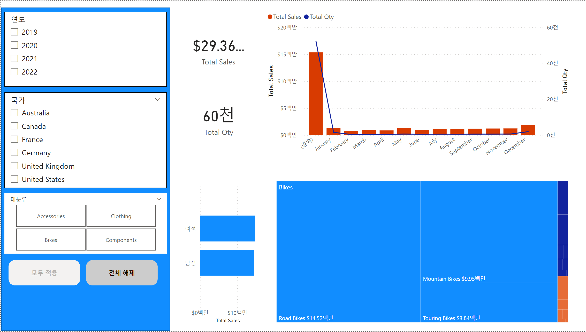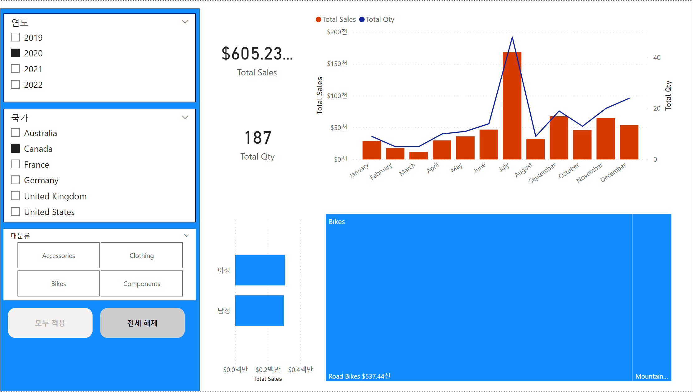 모든 슬라이서 적용 단추를 추가하고, 서식을 지정하면 됩니다. 그럼 기본적으로 슬라이서를 선택해도 데이터는 새로 고침이 되지 않고 적용 단추가 활성화됩니다. 적용 단추를 클릭하게 되면 보고서가 새로 고쳐지고 적용 단추의 스타일은 변경됩니다.