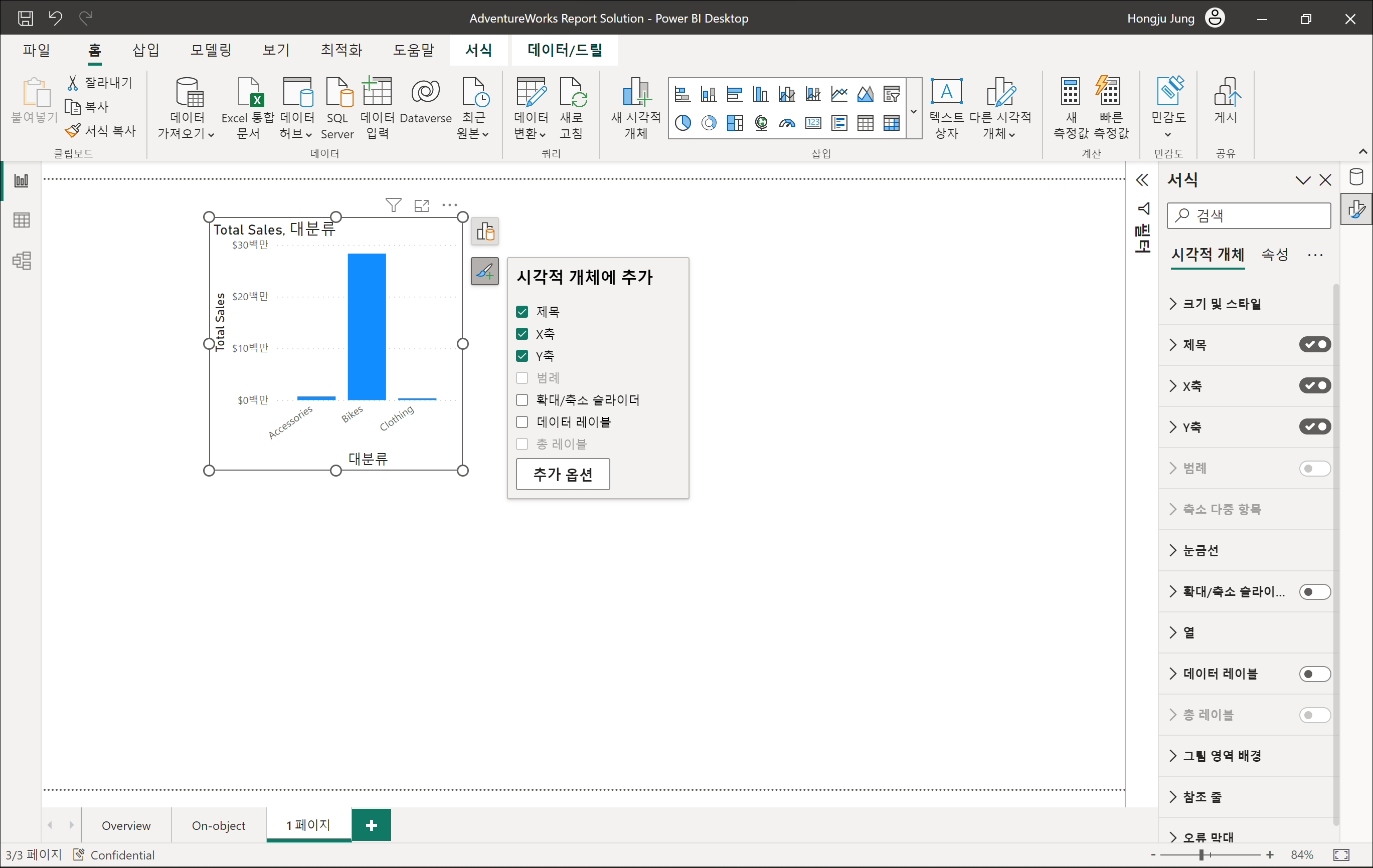 보고서 페이지에 시각적 개체를 추가하려면 오른쪽 클릭하여 [시각적 개체 추가]를 선택하면 됩니다. 새로 추가한 시각적 개체나 기존 시각적 개체를 선택하여 데이터 아이콘을 클릭하면 드래그 드롭하지 않고 데이터 필드를 쉽게 선택할 수 있습니다.