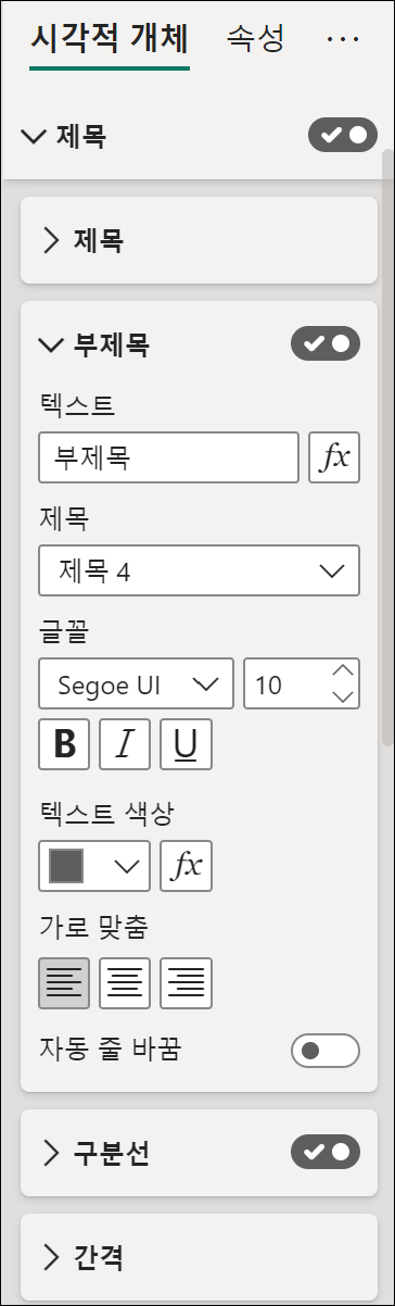 새로운 서식으로 ‘부제목’이 제공됩니다. 시각적 개체의 제목 아래에 부제목과 구분선을 추가하고, 간격을 지정할 수 있습니다.