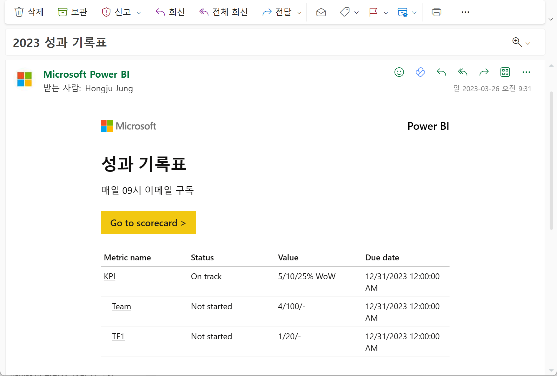 성과 기록표 이메일 구독(미리 보기)는 3월 업데이트 내용 중에 있었지만, 저번주에는 테넌트에 반영이 되지 않아 이제 내용을 정리해보았습니다.