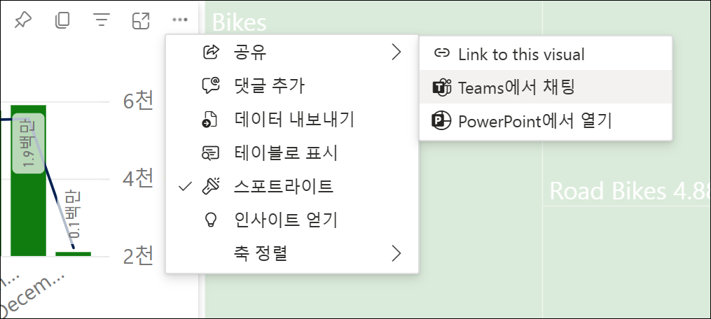 특정 시각적 개체의 … 메뉴에서 공유 > Teams에서 채팅을 클릭할 수도 있습니다. 이 경우는 해당 시각적 개체가 스포트라이트되어 공유됩니다.