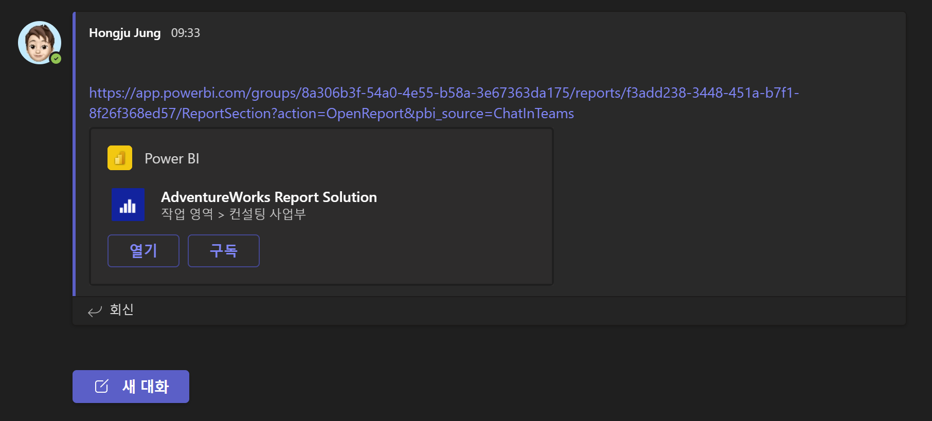 보고서에서 Teams에서 채팅을 살펴보겠습니다. 보고서의 경우 공유 미리 보기 아이콘이 나타나지 않아 Teams용 Power BI 앱에서 제대로 연결이 되지 않은 경우가 있었지만, 공유 미리 보기 아이콘을 통해 잘 연결이 되고 있습니다.