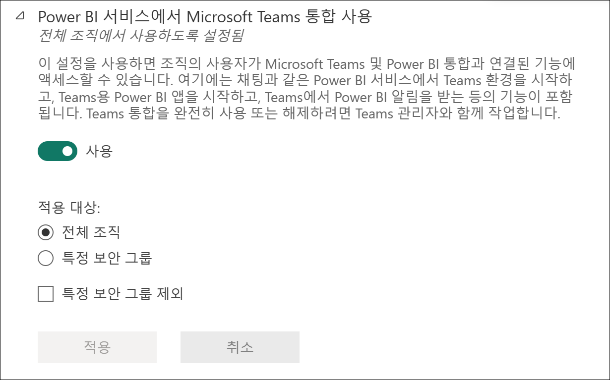 대부분의 기업에서는 Teams를 통해 협업을 하고 있습니다만, 필요시 관리 포털 설정의 테넌트 설정에서 메뉴를 숨기거나 특정 그룹에서만 보이게 할 수도 있습니다.