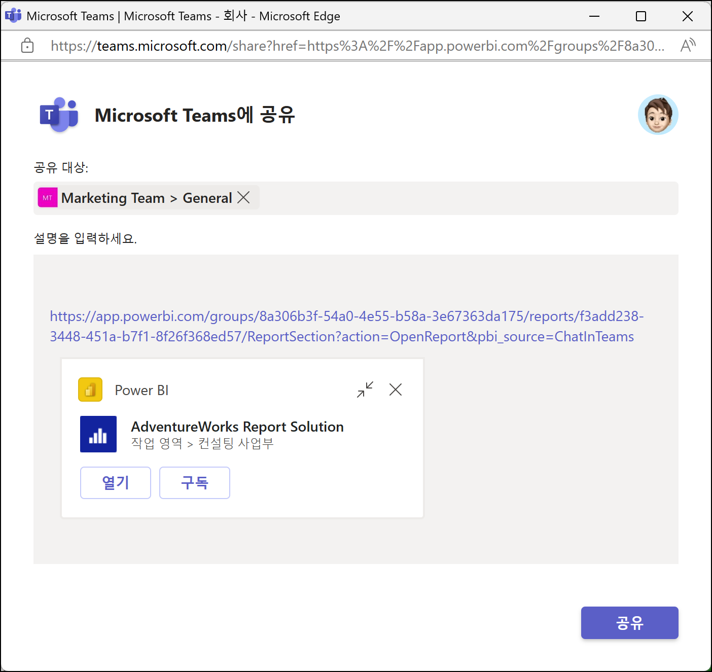 공유할 보고서로 이동하여 Teams에서 채팅이라는 메뉴를 클릭하게 되면 공유 창에서 Teams 채널 등을 선택해 공유하면 됩니다. 공유 미리 보기 아이콘을 볼 수 있으며, 아이콘을 삭제하게 되면 웹에서 해당 보고서가 연결됩니다.