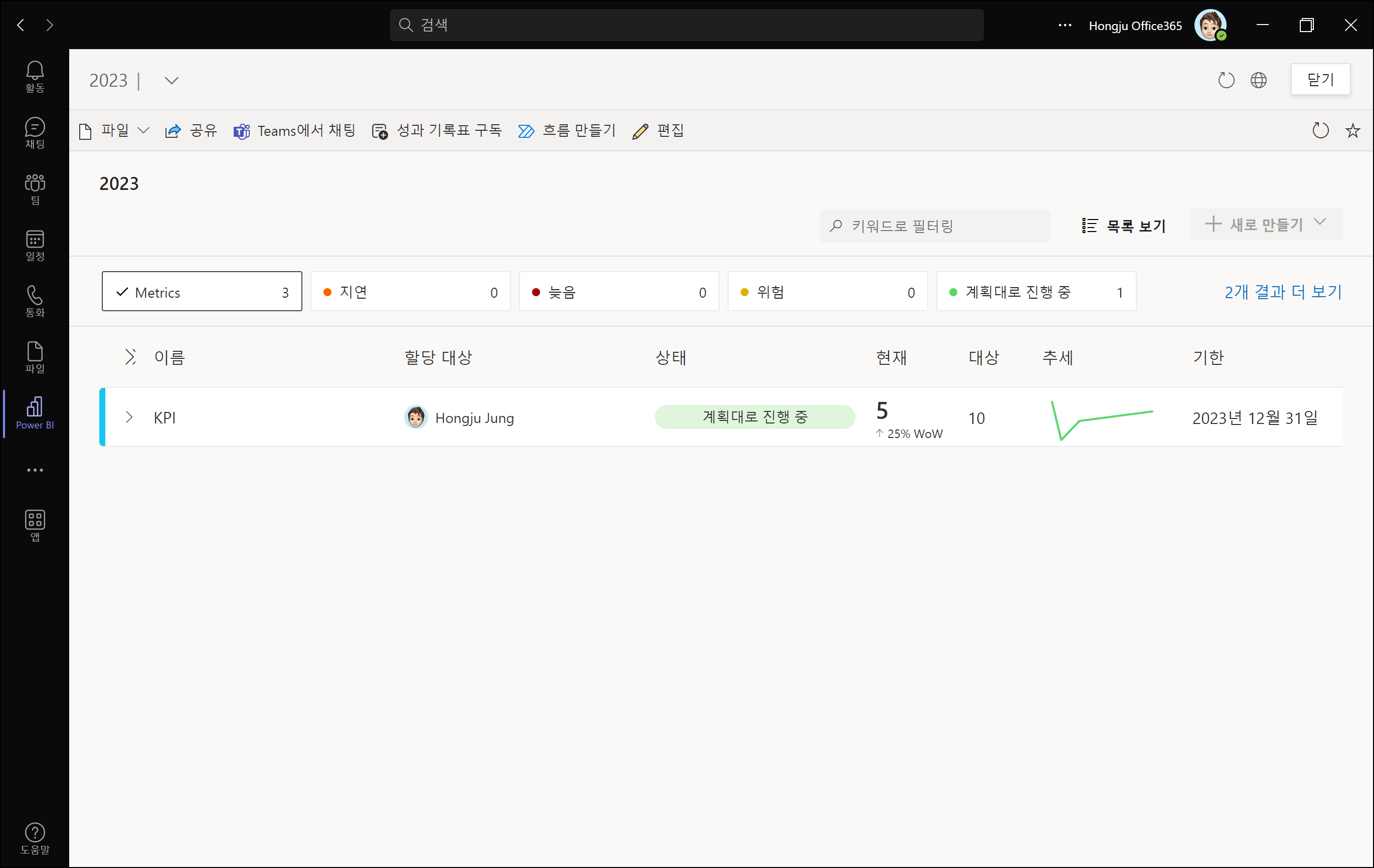 Teams에서 열기 아이콘을 클릭하게 되면, Teams용 Power BI 앱에서 해당 성과 기록표를 확인할 수 있습니다.
