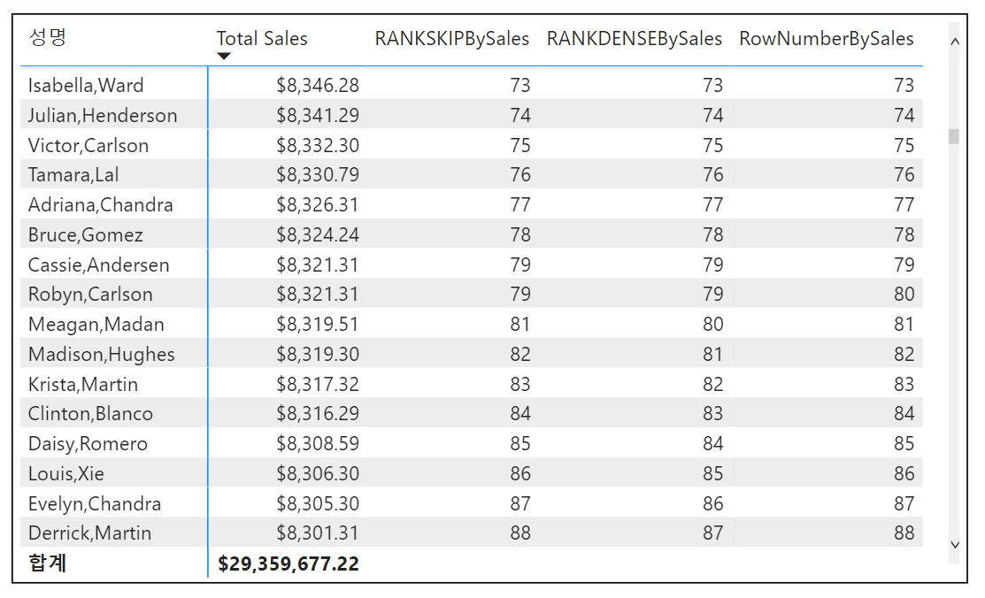 RowNumberBySales = ROWNUMBER(ALLSELECTED('고객'[성명]), ORDERBY('매출'[Total Sales],DESC))